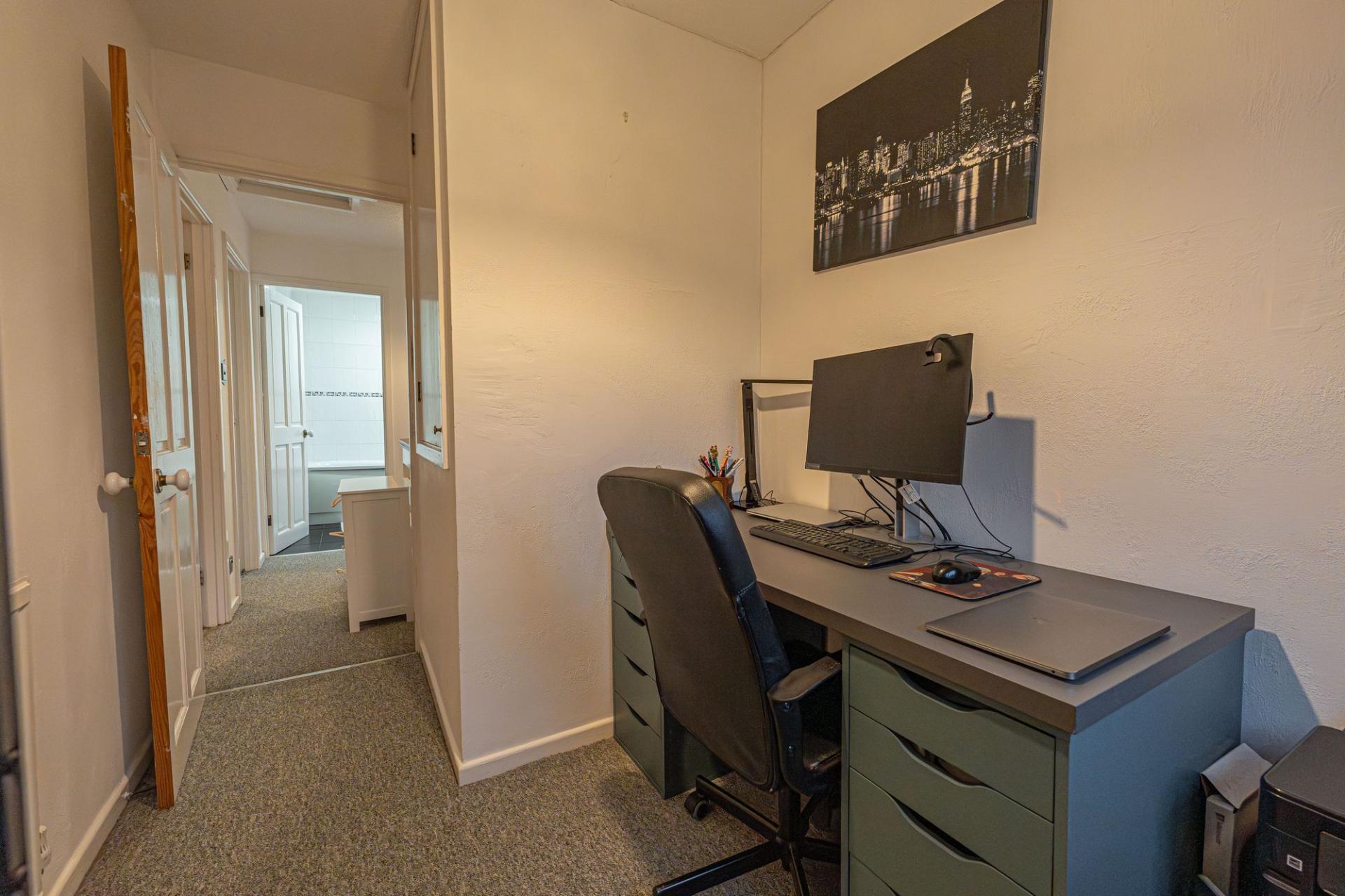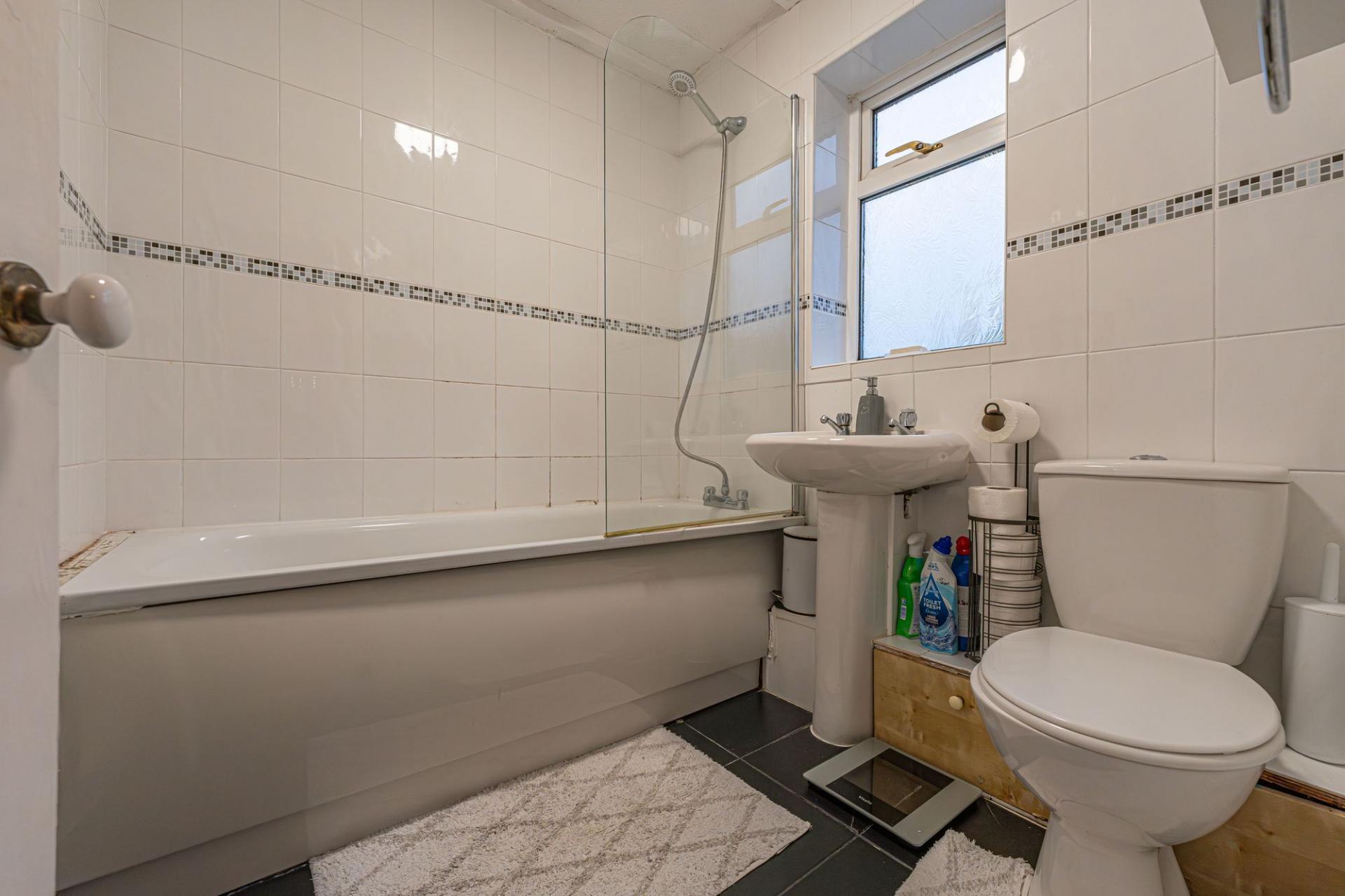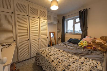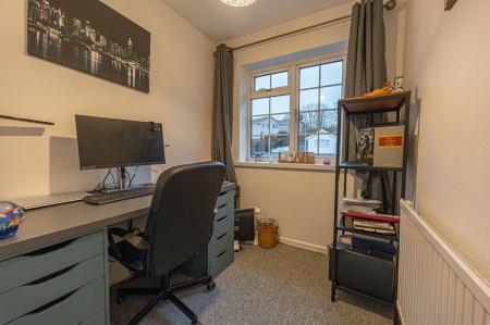To the first floor we have three bedrooms, two of which are double in size while the third is a comfortable single room, which is currently staged as a home office to showcase the practical use of this versatile space. Two of the bedrooms enjoy fitted wardrobes for easy storage, whilst the family bathroom from the hallway features a bath suite and overhead shower.