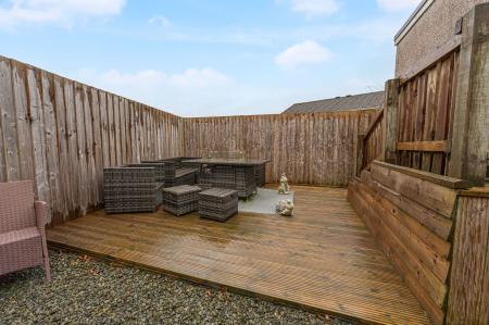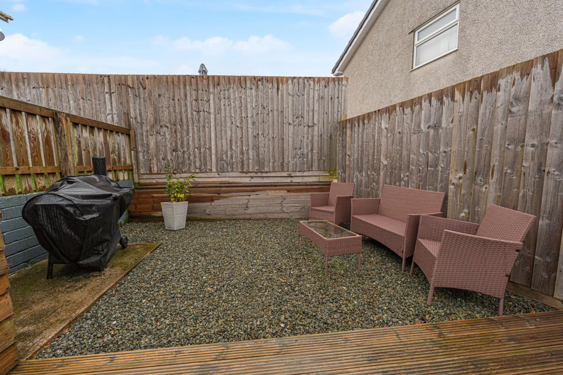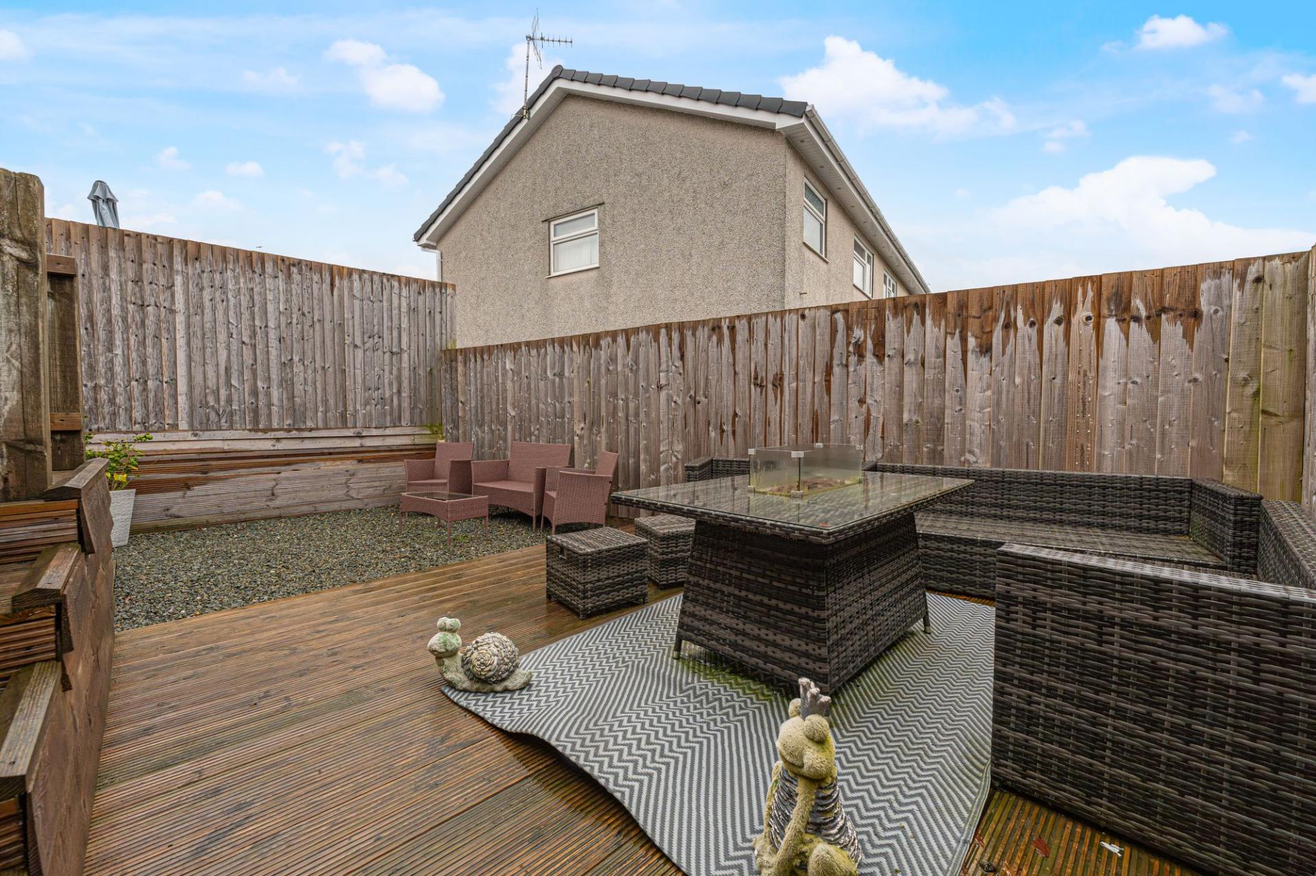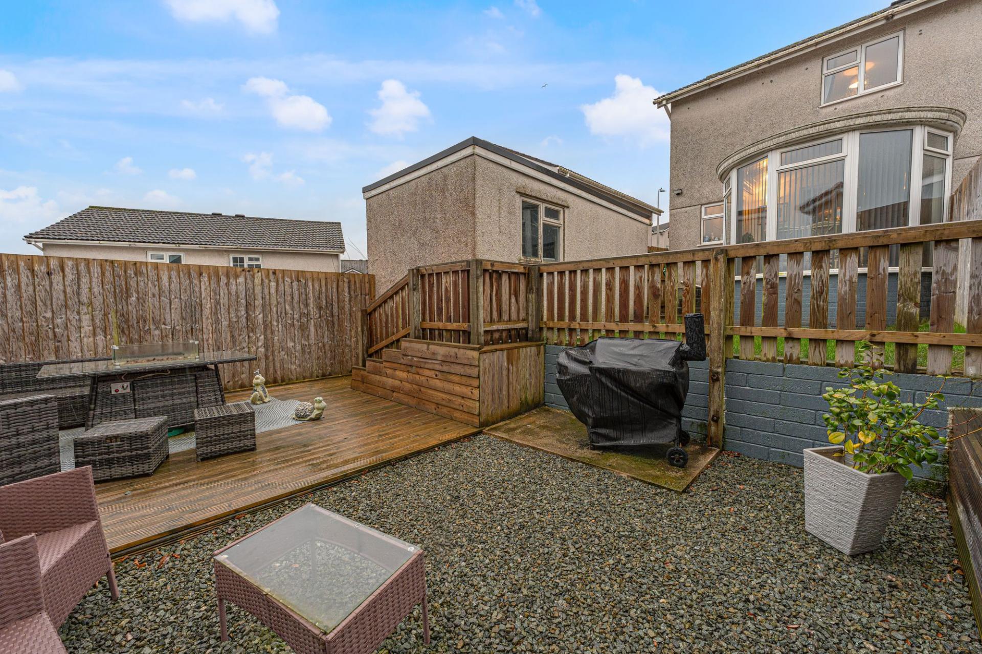Stepping outside we can find the fully enclosed rear garden, which impresses with an abundance of outdoor space that residents can enjoy. The garden has been designed for relaxation, with a grass lawn and ample seating areas beyond, consisting of a large deck and low maintenance pebble stone bed, highlighting an idyllic spot for al-fresco dining or entertaining guests. A side gate from the garden connects to the large driveway, providing off-road parking for at least three vehicles. The garage can be used for additional parking and storage, and is equipped with power and lighting. Additional parking is available directly in front of the home, with the added benefit of an EV charger, and a further garden area creates an attractive approach to the property.