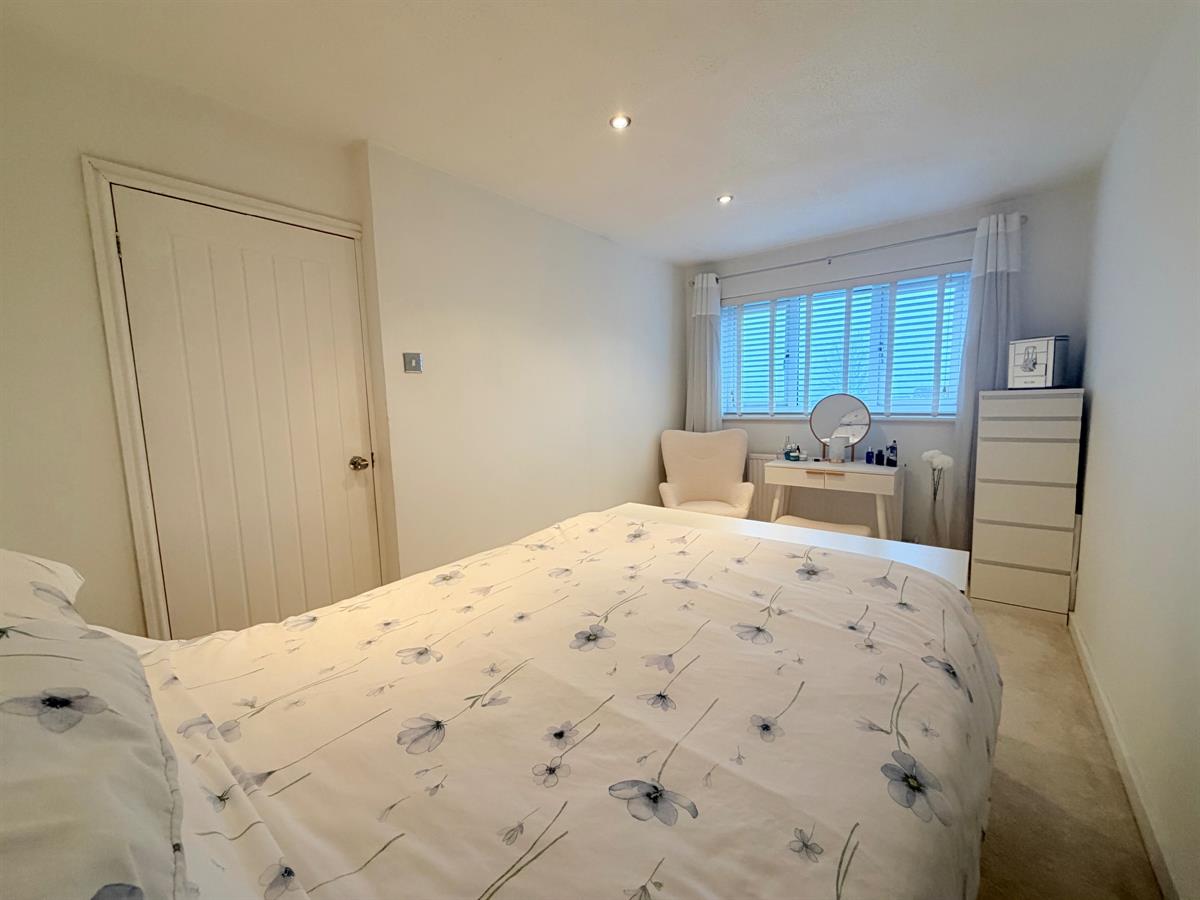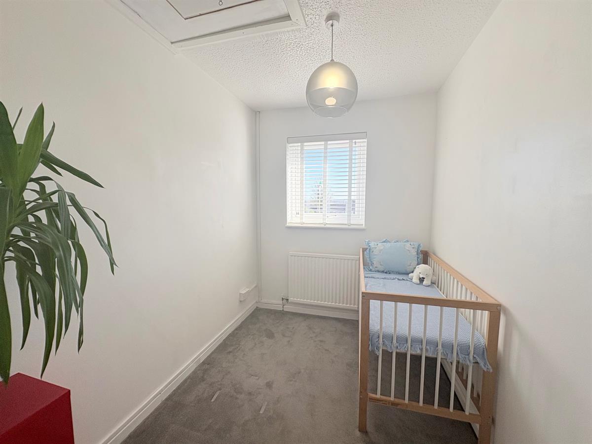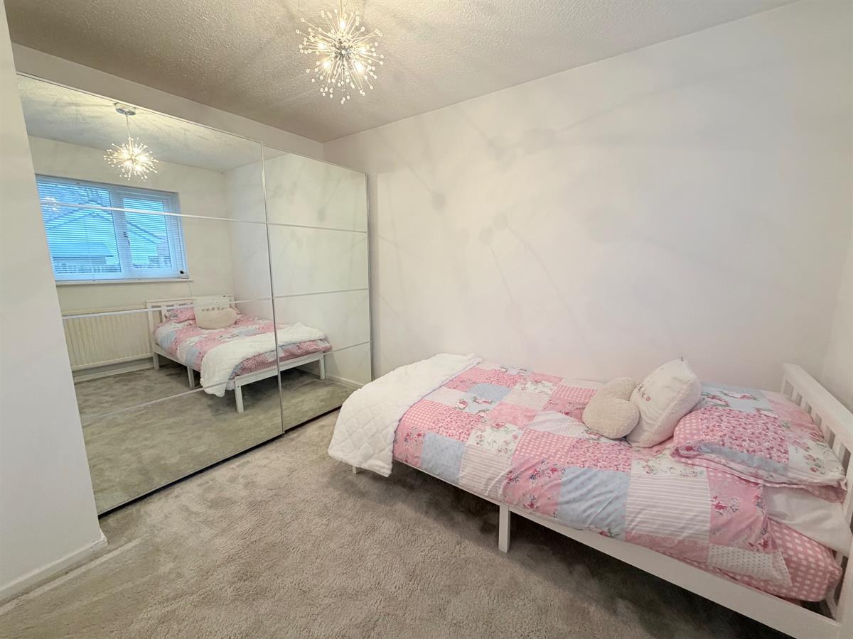 White door with silver handle upon entry, beige carpet,white skirting boards, white walls, one window overlooking front of the property, one white radiator, one dual plug socket, two single plug sockets.