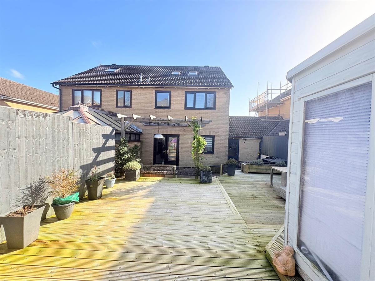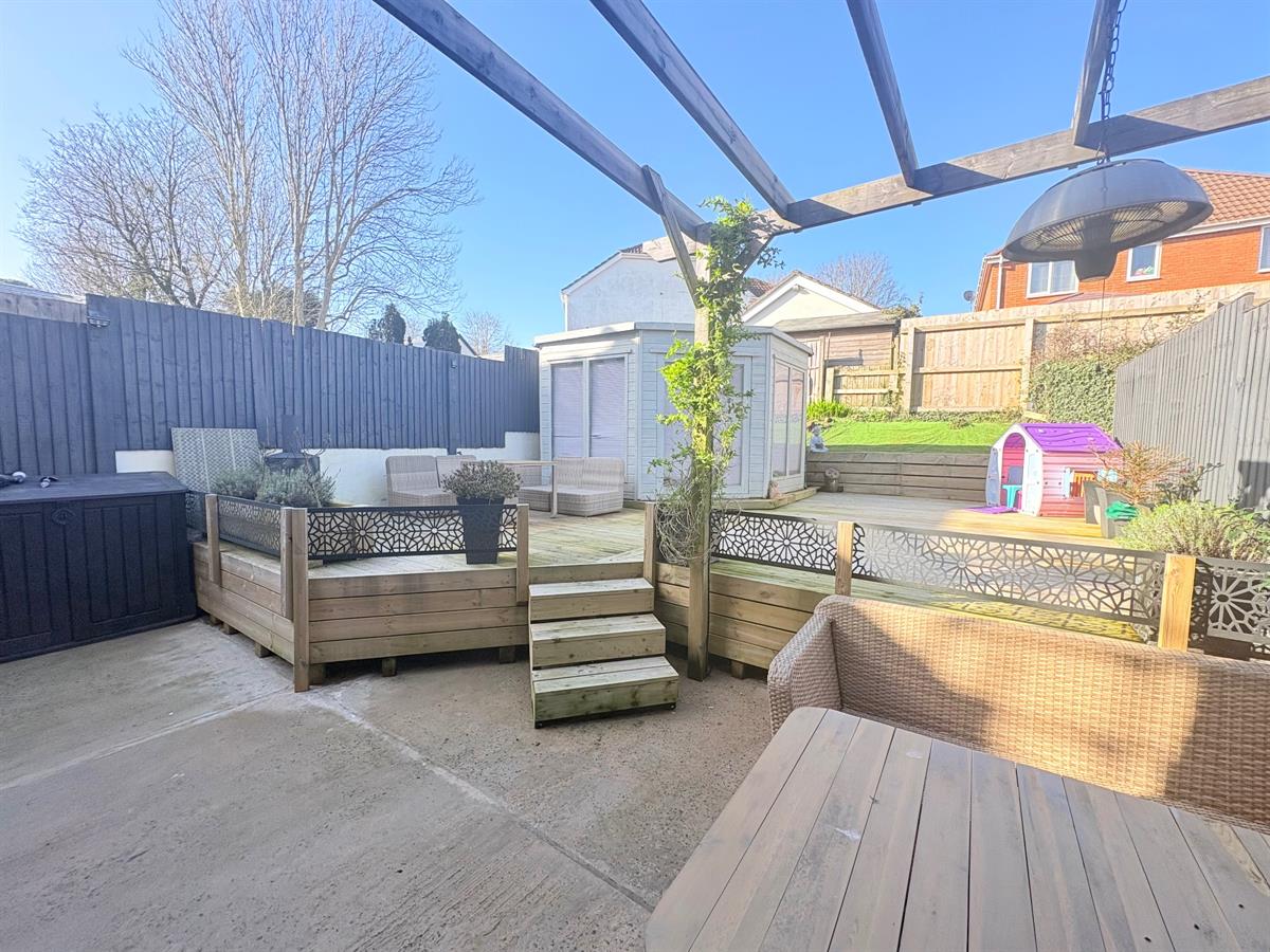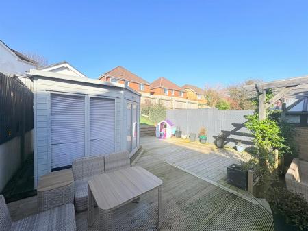 The exterior of the property offers a spacious rear with decking and an outbuilding, the side of the property showcases a converted garage currently offering a utility and playroom, the front of the property offers a driveway suitable for off road parking for a vehicle.