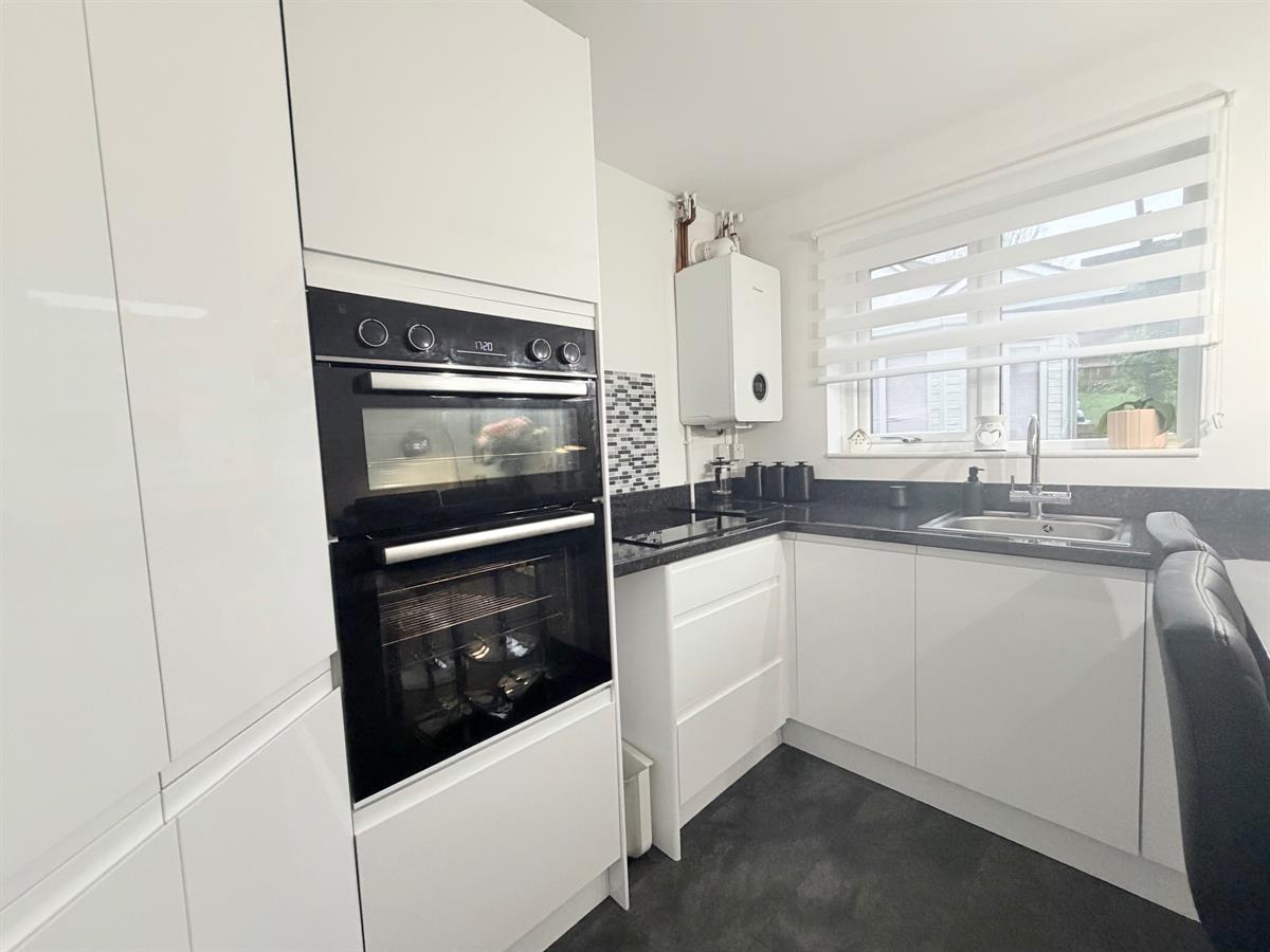 White door with silver handle upon entry, black tiled flooring, white skirting boards, white walls, white kitchen cabinets, black worktops, silver sink with silver taps, one white radiator, two dual plug sockets, one window overlooking rear of the property, dual doors leading to rear.