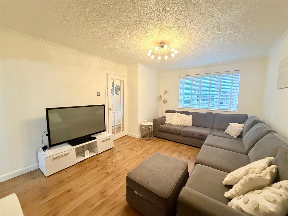 White door with silver handle upon entry, wood effect laminate flooring, white skirting boards, white walls, one window overlooking front of the property, one white radiator, two visible dual plug sockets.