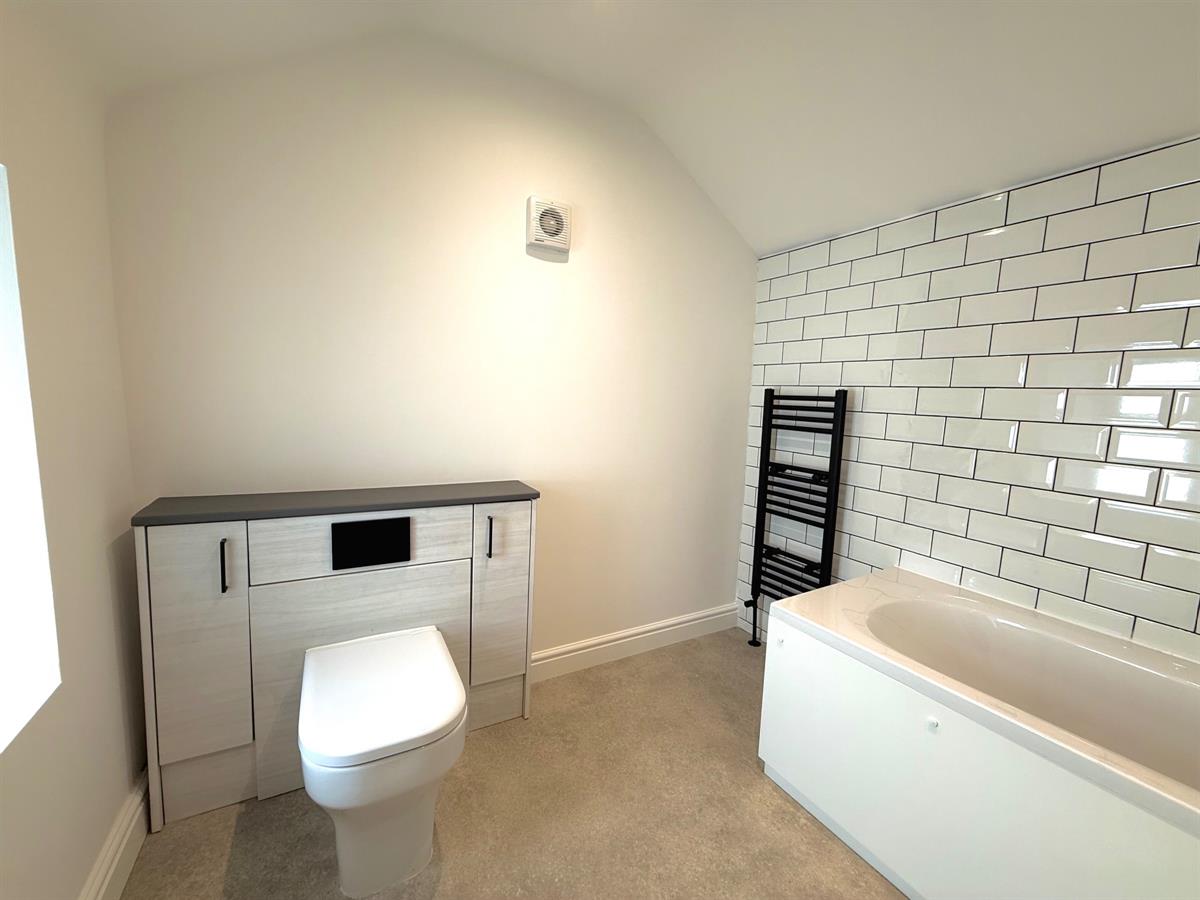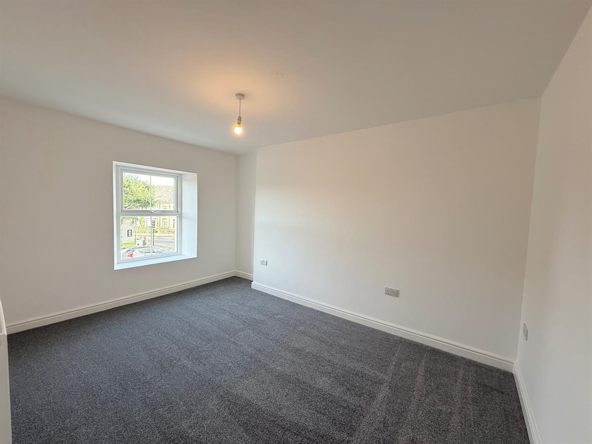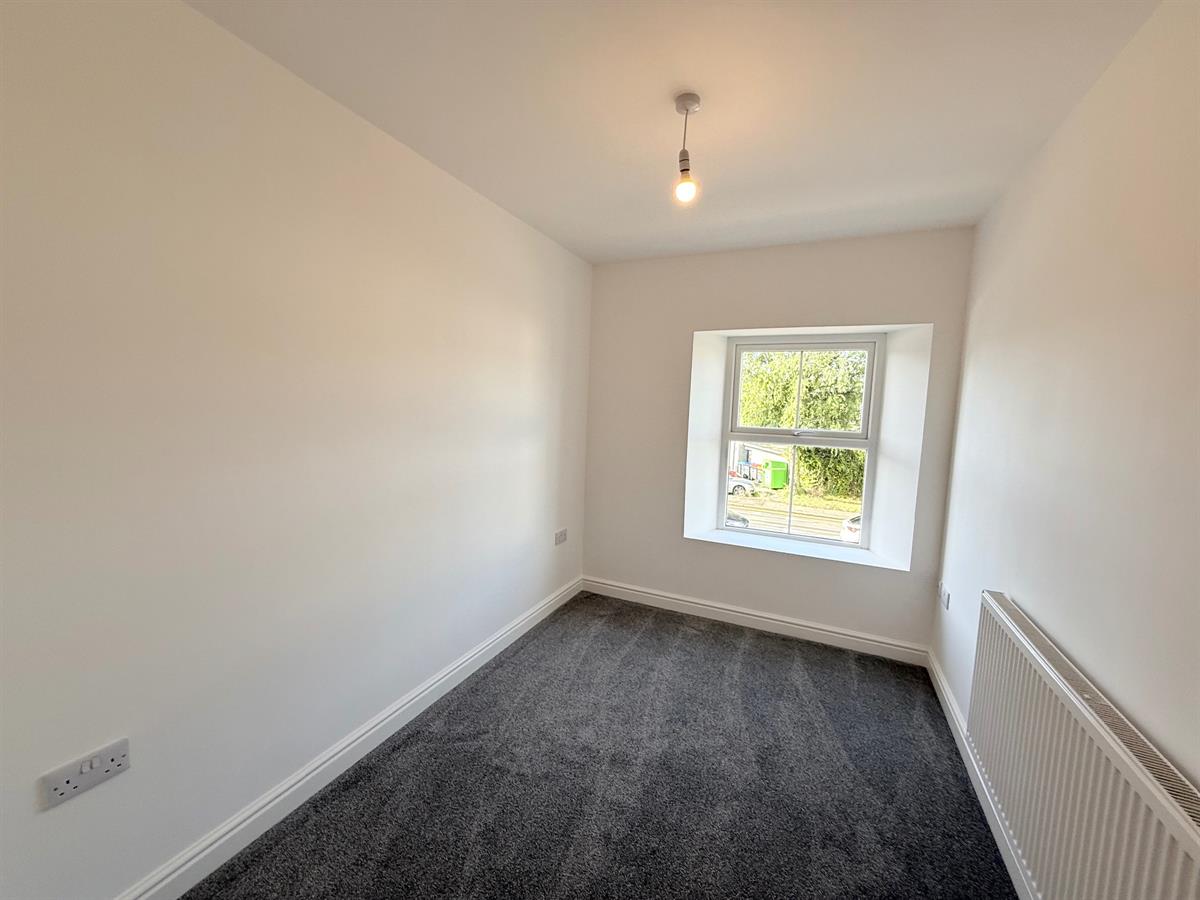Brown door with black handle, grey carpet, white walls, skirting boards and ceiling with one light, white framed window looking to rear, white radiator, 3 double plug sockets