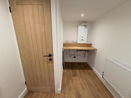 Brown wooden door with black handle, wooden effect lino flooring, white walls, skirting boards and ceiling with 3 spotlights, wooden counter with plumbing underneath for washing machine, white radiator, 2 double plug sockets, 2 single plug sockets, door to;