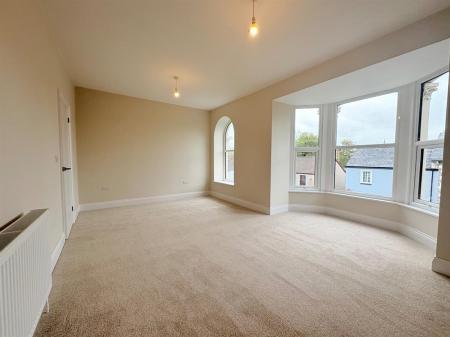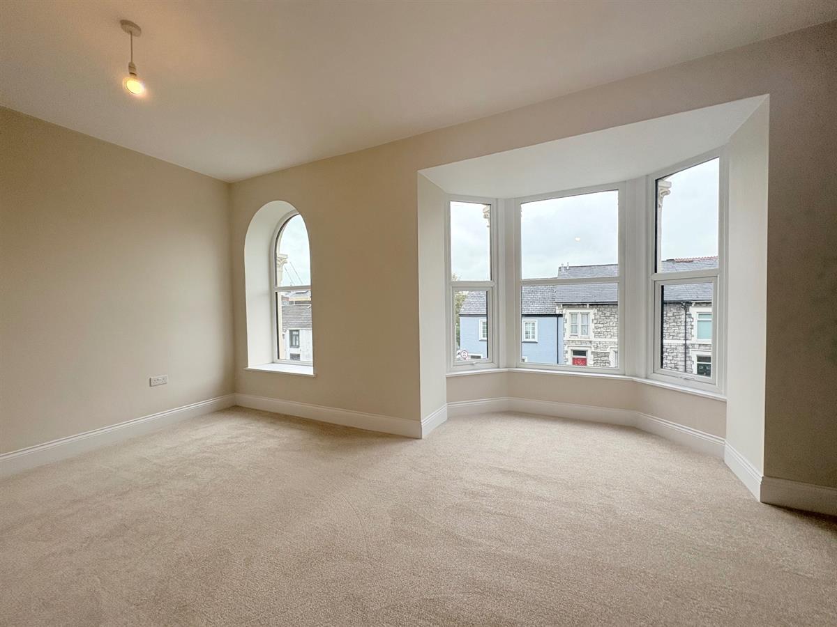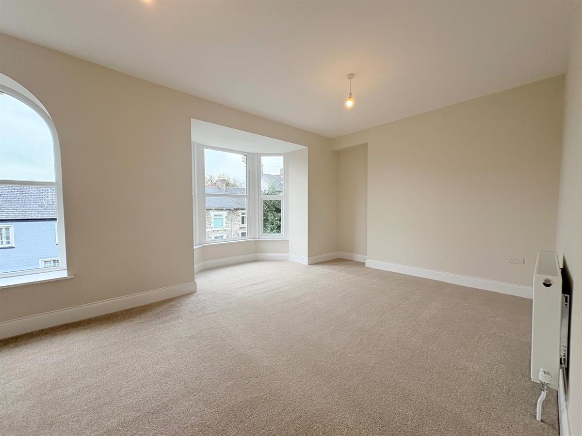 White door with black handle upon entry, light beige carpet, white skirting boards, neutral painted walls, four dual plug sockets, one white radiator, two pendant lights, one window overlooking front, one bay window overlooking front.