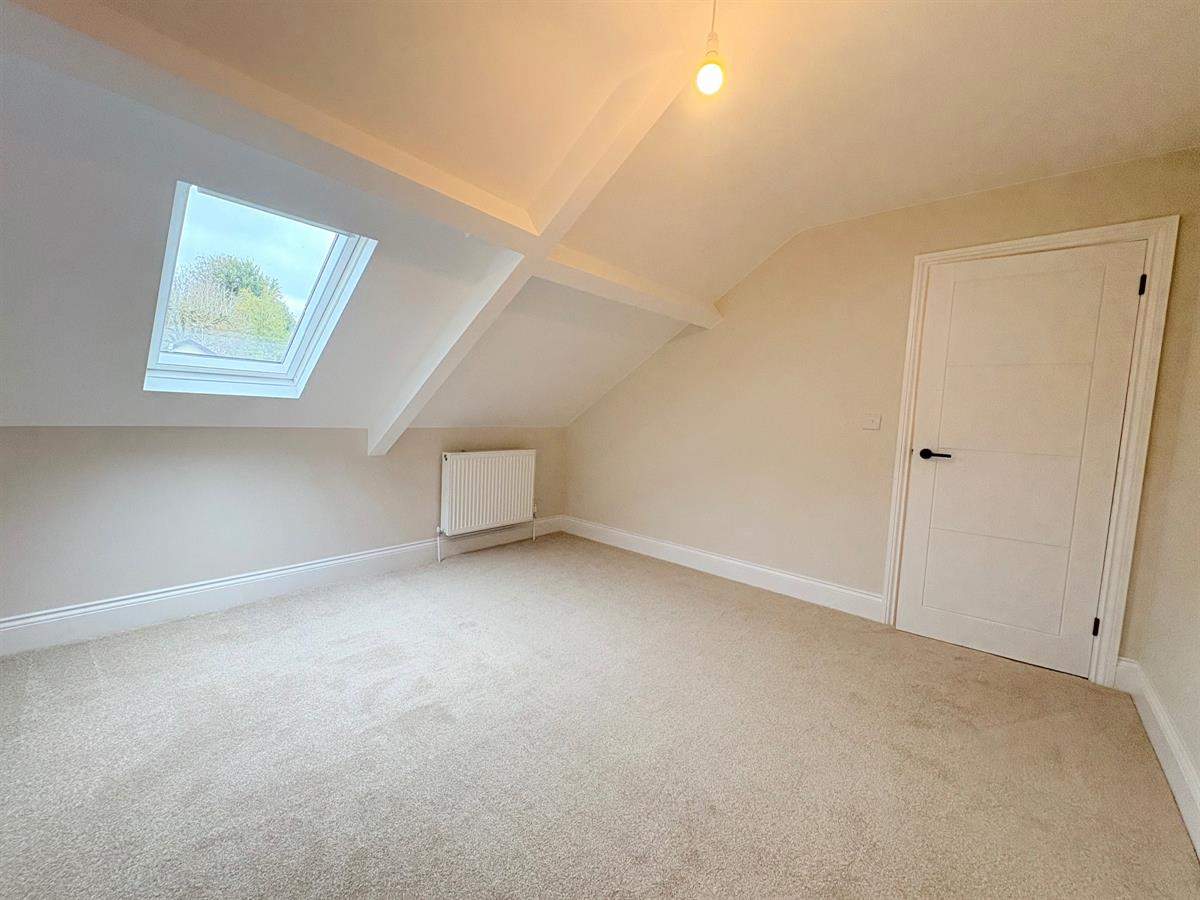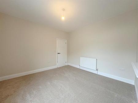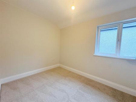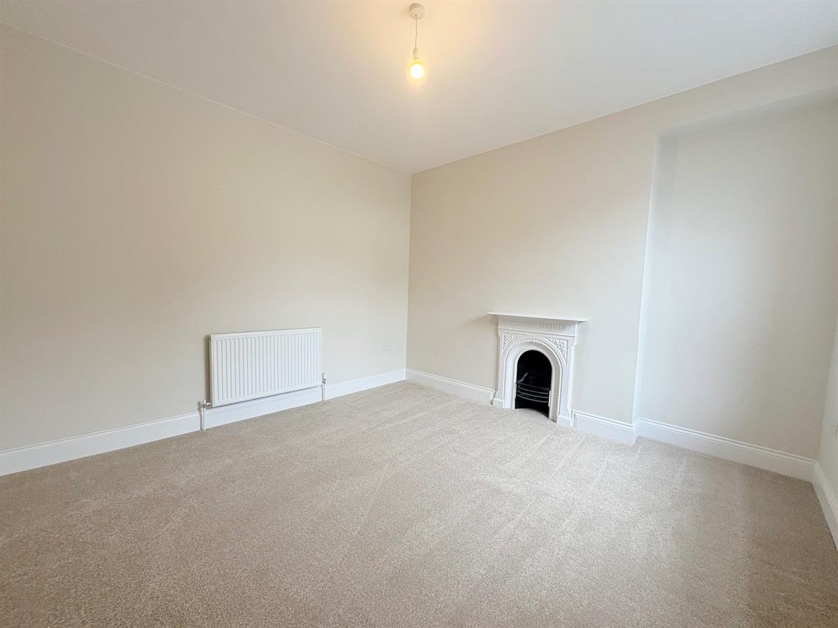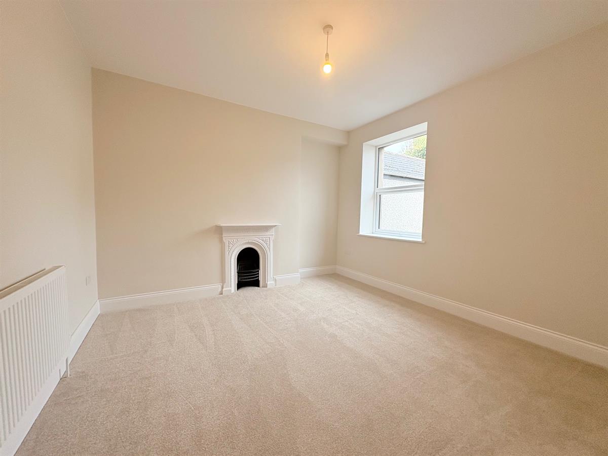 White door with black handle upon entry, light beige carpet, white skirting boards, neutral painted walls, one white radiator, three dual plug sockets, one window overlooking rear, one white painted fireplace, one pendant ceiling light.