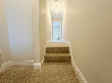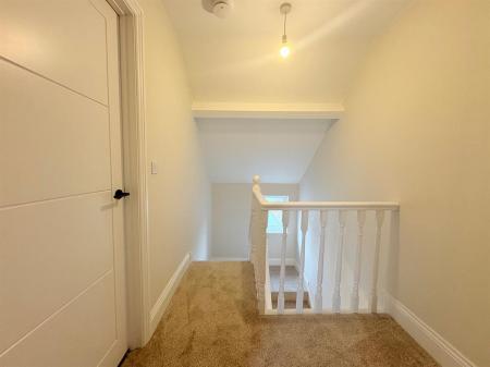 Second floor landing, light beige carpet, white skirting boards, neutral painted walls, one dual plug socket, one pendant light, leading to bedrooms two and three, stairs leading to third floor.