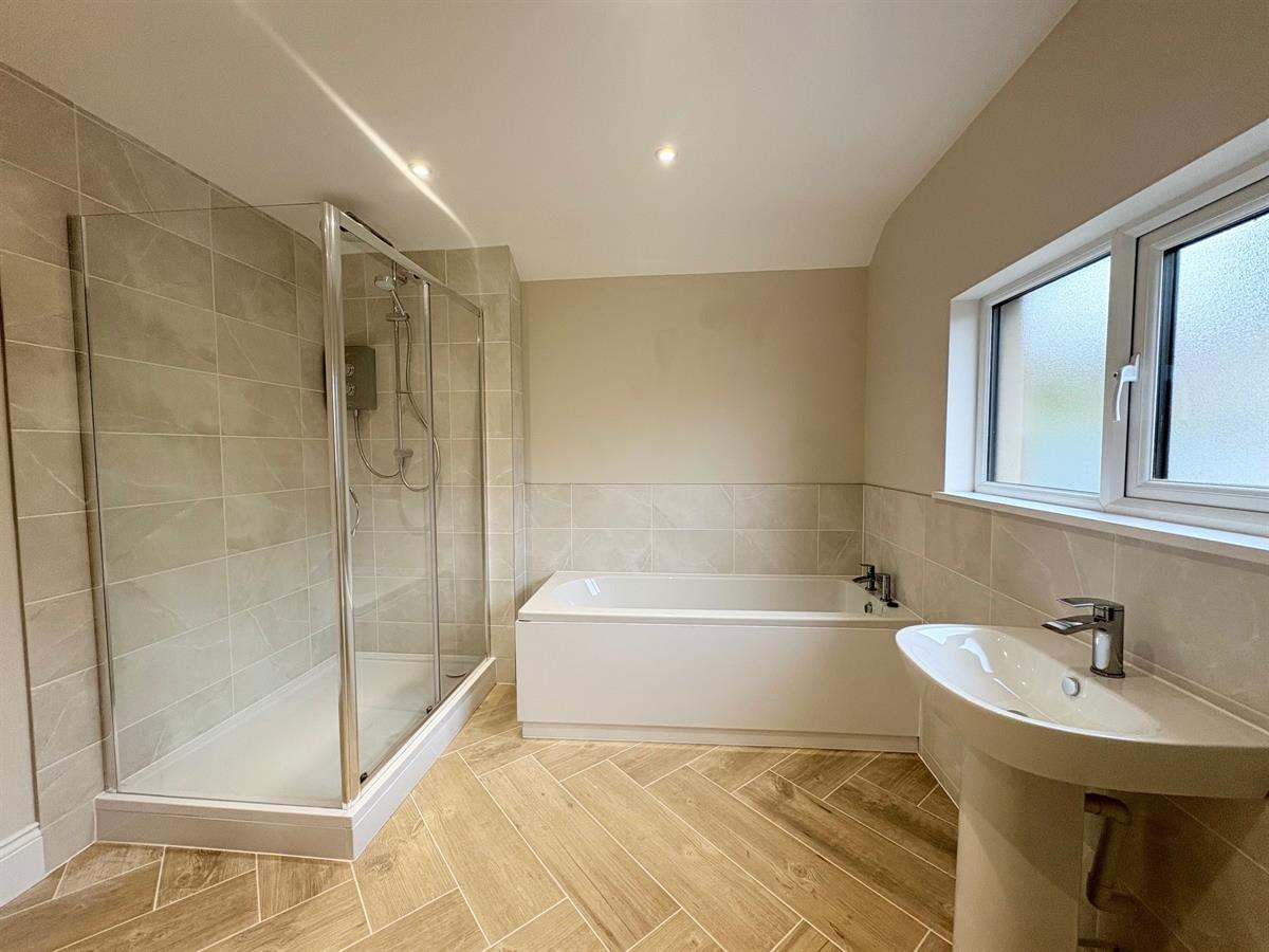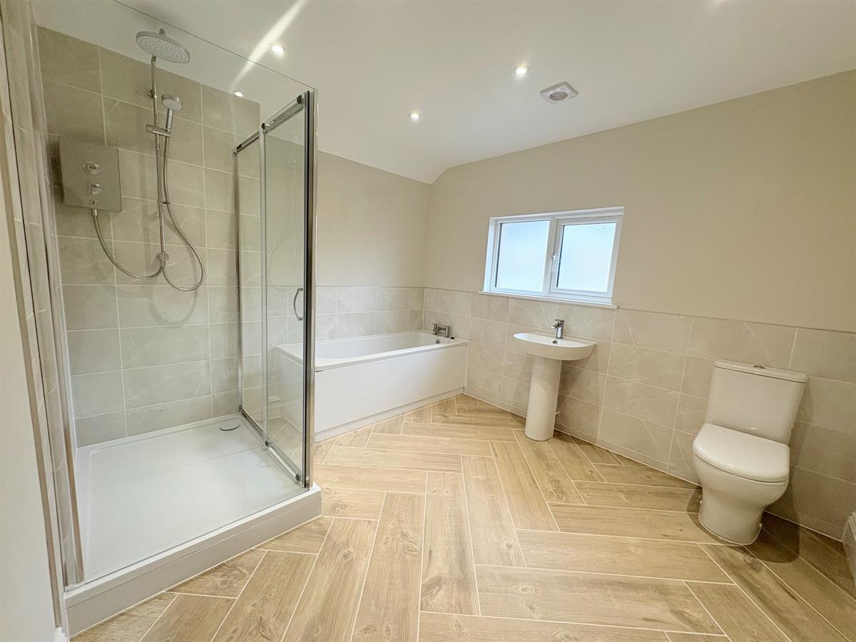 First floor bathroom, white door with black handle upon entry, white skirting boards, wood effect tiled flooring, neutral painted walls, light grey patterned tiles surrounding appliances, white shower with silver showerhead unit, entry by sliding glass door, white bath with silver taps, white sink with silver taps, white toilet, one window overlooking rear, six ceiling spotlights, extraction fan fitted.