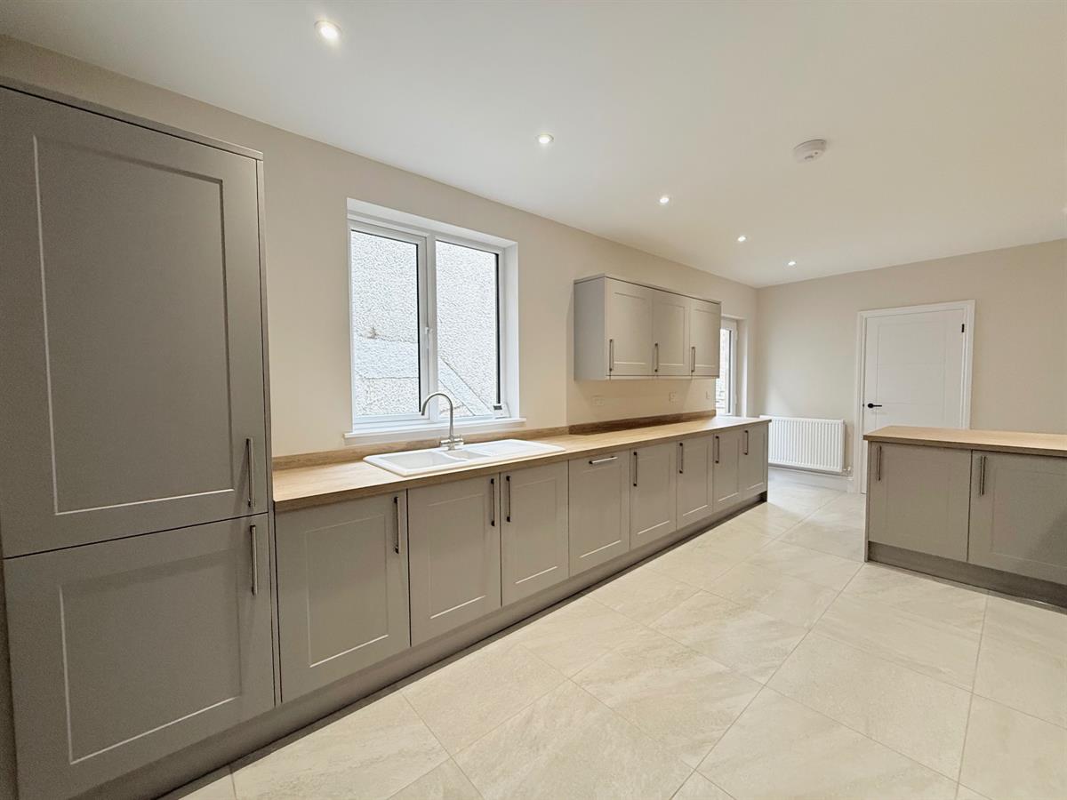 White door with black handle, large-format, light grey porcelain tiles, neutral walls, white skirting boards, white ceiling with 10 spotlights, grey kitchen cabinets with stainless steel handles, paired with light oak-effect worktop, breakfast bar, white ceramic double sink and drainer with stainless steel mixer tap, integrated oven and microwave, integrated electric hob with built in extractor fan, integrated dishwasher plus integrated washing machine, 2 white radiators, 5 double plug sockets, white framed double glazed window behind sink, white double glazed PVC door to rear, white door to utility and WC