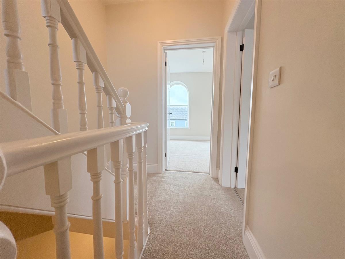 Third Floor Landing, light beige carpet, white skirting boards, neutral painted walls, one pendant light, white painted banister, leading to bedroom four and five.