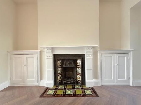 White door with black handle, neutral painted walls, white skirting boards, white ceiling with 2 pendant lights, warm herringbone wood-effect flooring, 2 white radiators, 2 chimney breast walls, 2 alcoves with storage shelves and doors, original open chimney fireplace with original tiling, white glossed mantle piece, 6 double plug sockets, socket with Ariel cables, modern uPVC sliding patio doors opening onto the rear courtyard, large uPVC bay windows looking out to front forecourt
