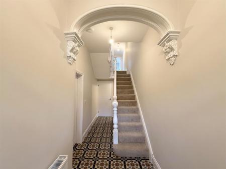 Neutral painted walls, white skirting boards, white ceiling with 2 pendant lights, smoke alarm, original ornamental archway, coloured patterned tiles, white radiator, double plug socket, stairs to first floor, door to reception room, door to under stairs cupboard, door to kitchen