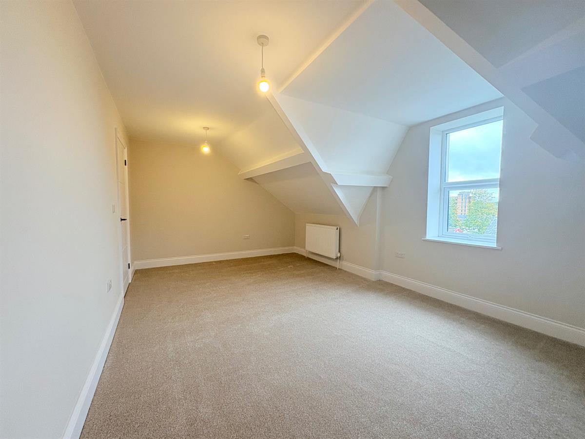 White door with black handle upon entry, light beige carpet, white skirting boards, neutral painted walls, one white radiator, three dual plug sockets, one white radiator, one window overlooking side, one pendant light.