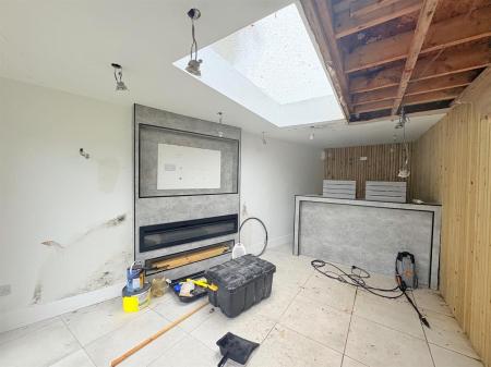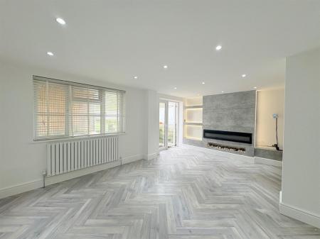 Brown double doors upon entry, light grey and beige wood affect flooring, white skirting boards, white painted walls, one feature wall with electric fireplace, three dual plug sockets, one white radiator, one window overlooking rear, fourteen ceiling spotlights, double glass doors leading to rear garden.