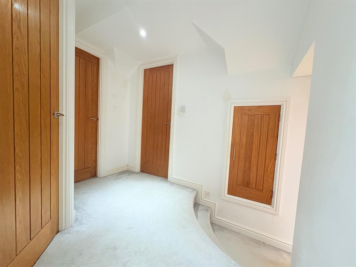 White door with silver handle upon entry, light grey tiled flooring, white skirting boards, white painted walls, one white radiator, three spotlights three brown doors with silver handles upon exit, leading to bedroom, cloakroom and kitchen.