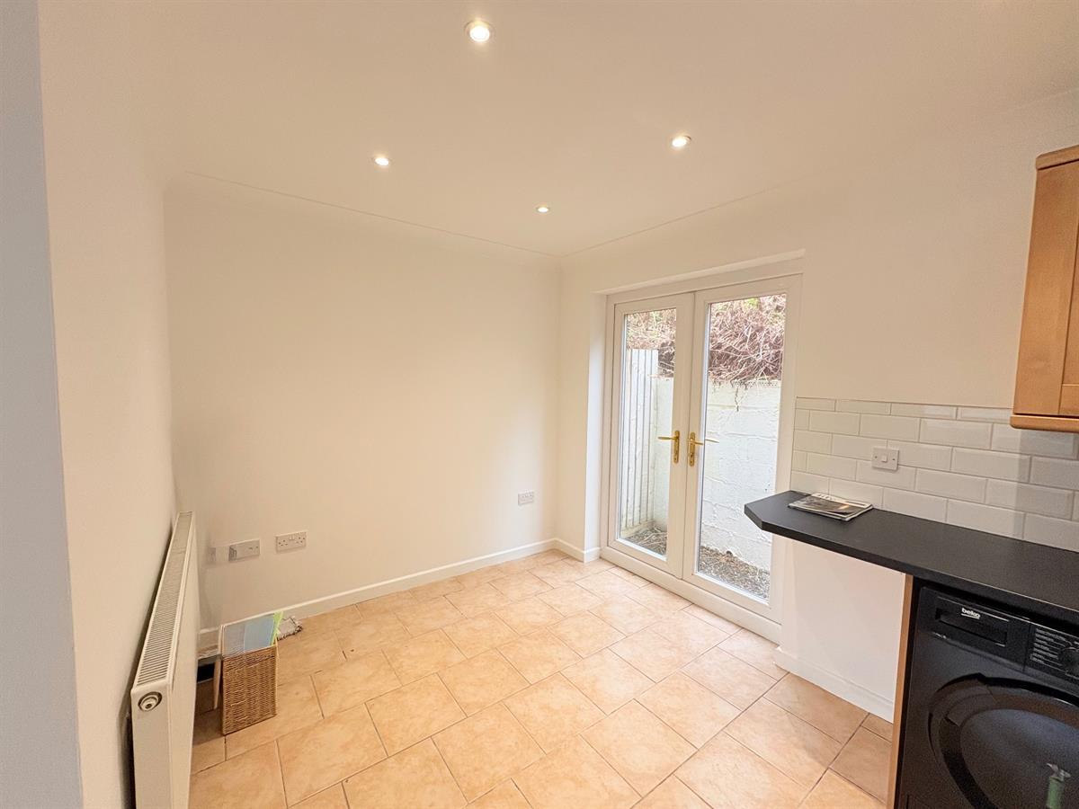 Open entry from living room, beige tiled flooring, white skirting boards, white walls, one white radiator, four dual plug sockets, wood kitchen cabinets, black worktops, silver sink, one window overlooking rear, dual doors leading to exterior.