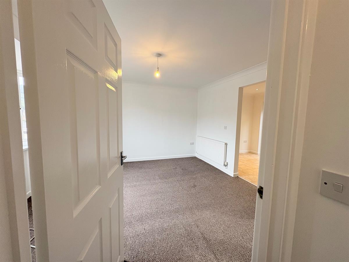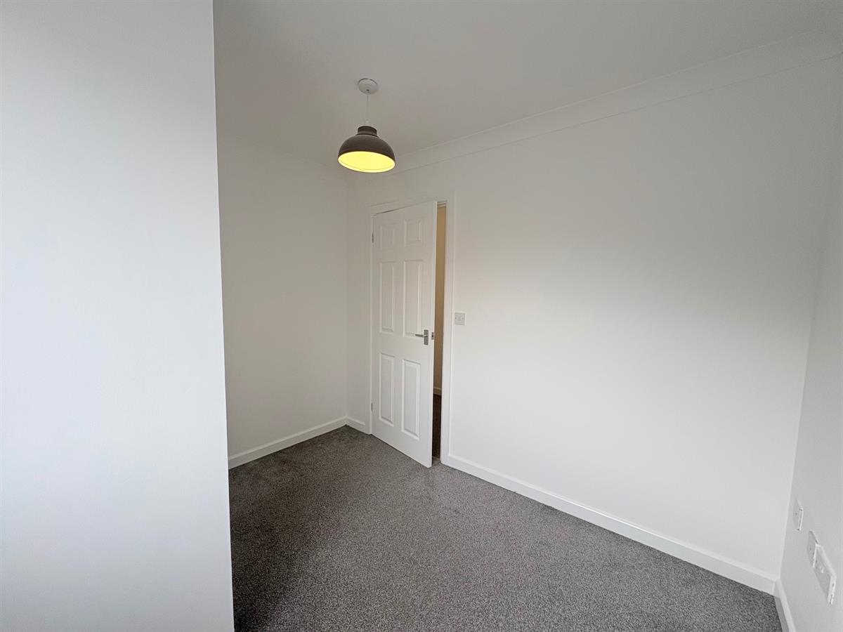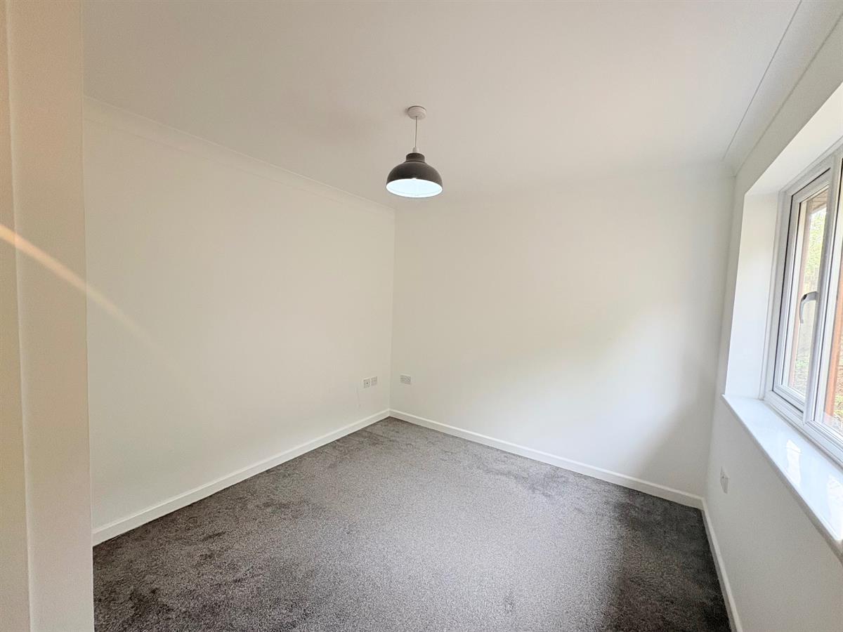 White door with silver handle upon entry, grey carpets, white skirting boards, white walls, three dual plug sockets, one white radiator, one window overlooking rear.