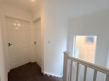 Brown carpeted stairs with a white bannister leading to brown carpeted landing, white skirting boards, white walls, one frosted window overlooking side, access to the loft via hatch, four white doors upon exit to bedrooms and bathroom.