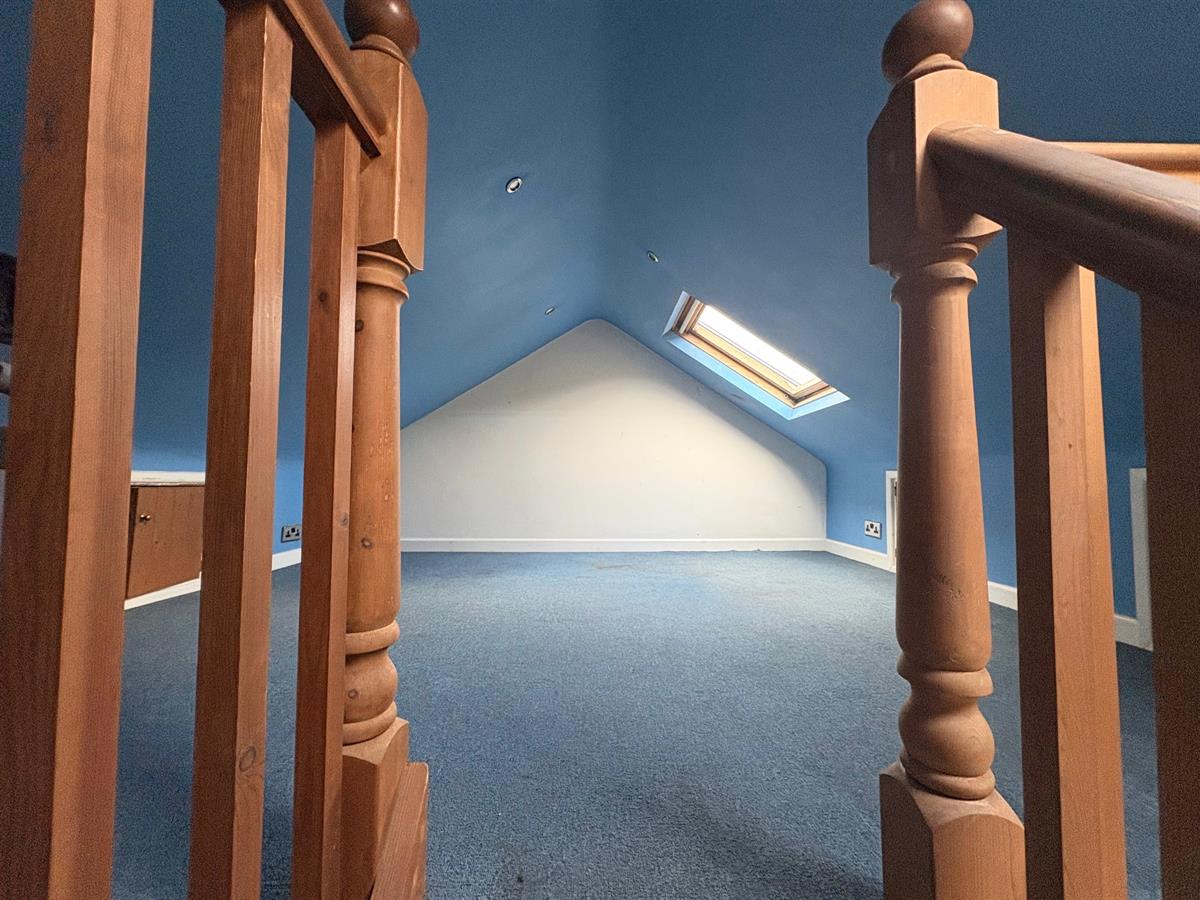 Access from landing, navy carpeted stairs brown door on entry, wooden bannister, navy carpet, white skirting boards, two light blue painted walls, two white panted walls, three dual plug sockets, five ceiling spotlights, two skylights