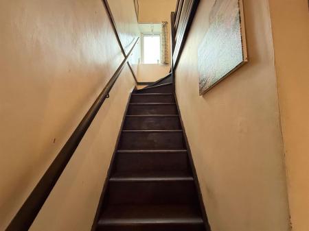 Brown wooden stairs, pale orange walls, brown skirting boards, brown wooden handrail, white framed window at top of the stairs looking to rear