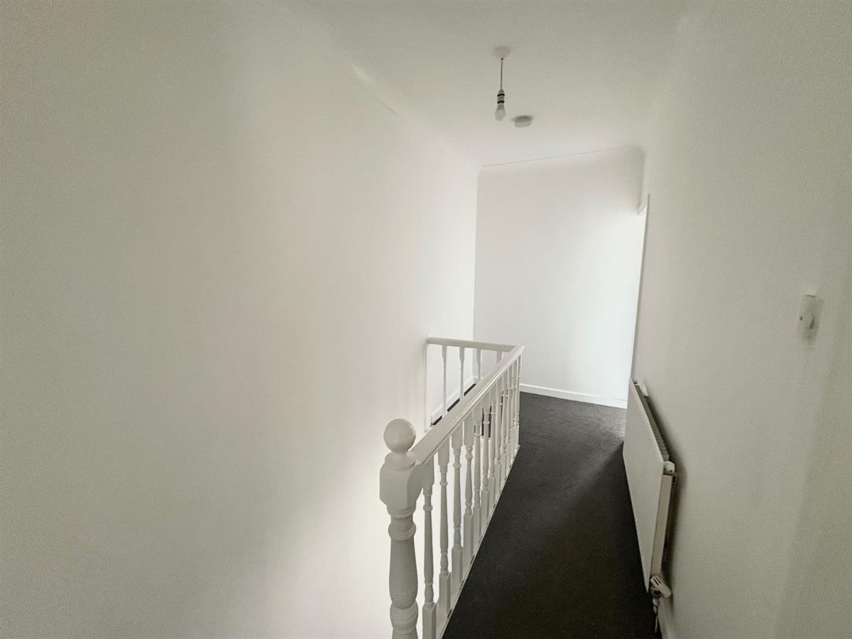 Laminate flooring, one radiator, cupboard housing electricity meter, coving, stairs to first floor, open plan to:
