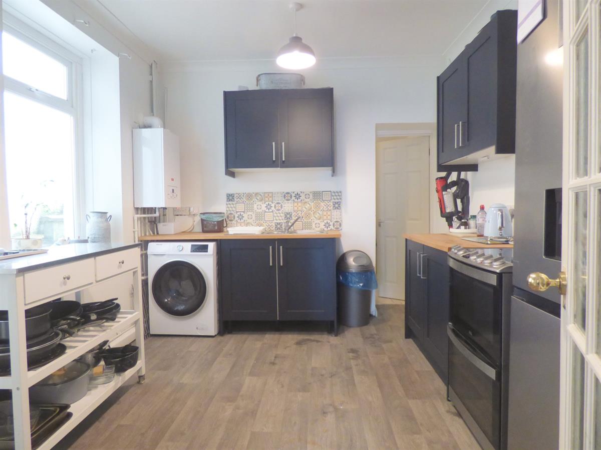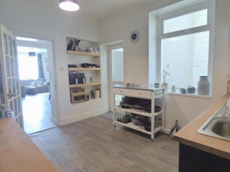 Fully fitted kitchen with one and a half bowl sink and drainer with mixer tap, space for electric cooker, space for fridge freezer, plumbing for washing machine, Combi boiler, ceramic tile splashback, vinyl flooring, alcove with shelving, under stairs storage cupboard, one radiator, various power points, coving, window and door to side, door to: