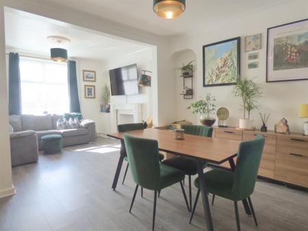 Laminate flooring, two radiators, various power points, feature fireplace, alcoves; one with cupboard housing gas meter, coving, electric smoke alarm, telephone point, windows to front and rear, glazed door to:
