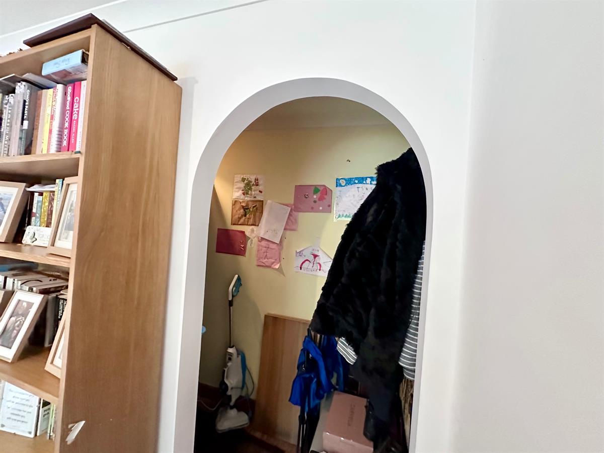Curved archway from dining room, brown laminate flooring followed through from dining room, yellow walls, white ceiling with 3 spotlights