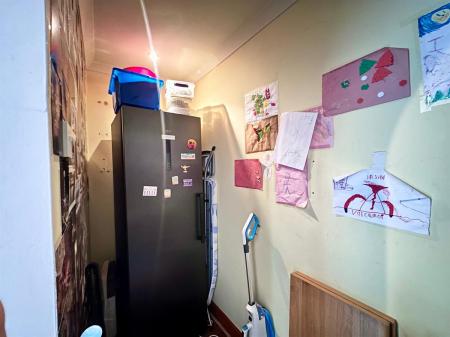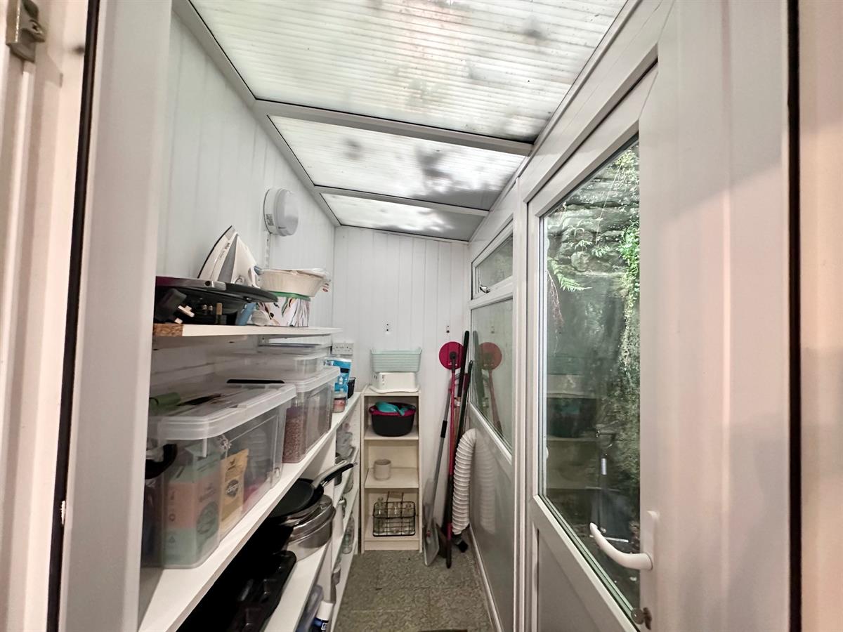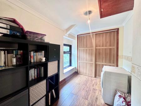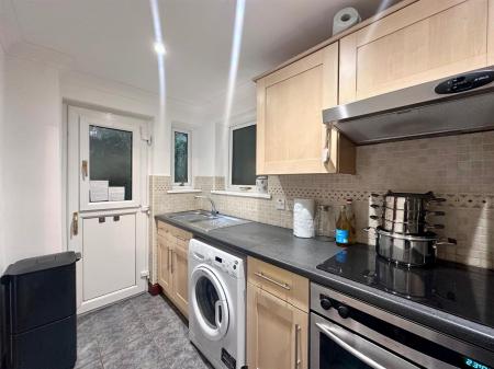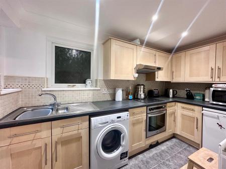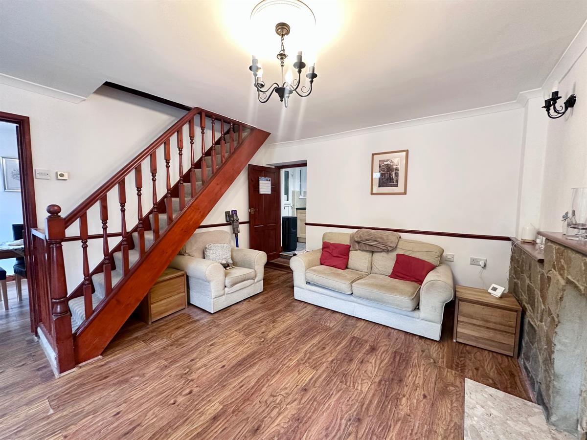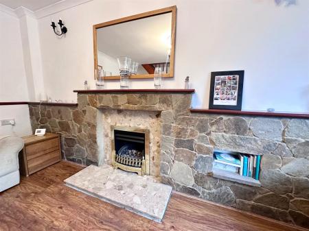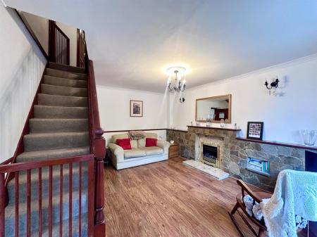The ground floor offers two reception rooms, creating flexible space for relaxing or entertaining. The front living room is filled with natural light from the large window and features a stone-effect fireplace, while the second reception room leads directly to the kitchen and out to the rear garden. A utility area and a lean-to provide additional practicality and storage, making the layout well-suited to everyday living.