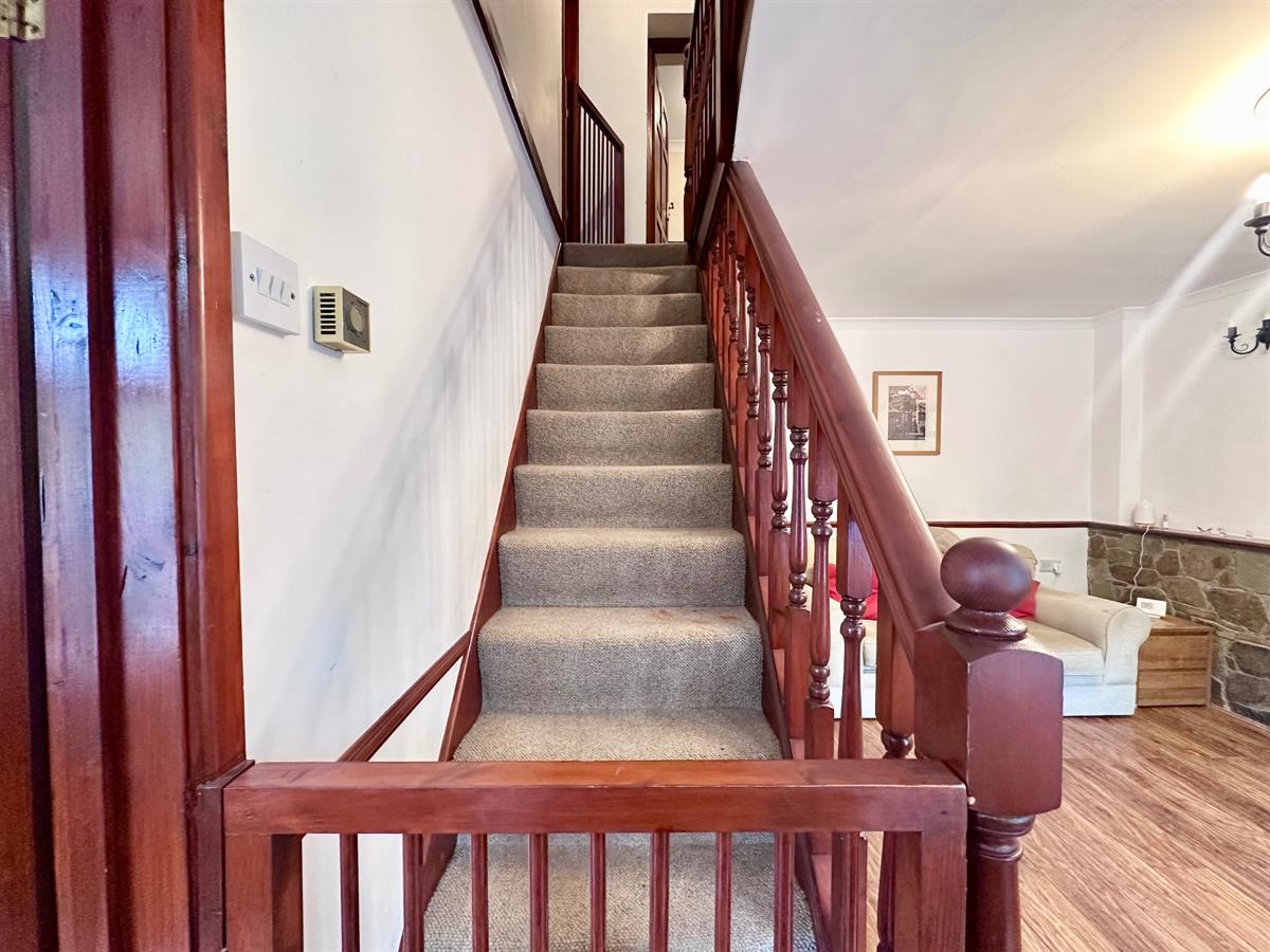 Beige carpet, brown/ red wooden banister and gate at bottom and top of stairs
