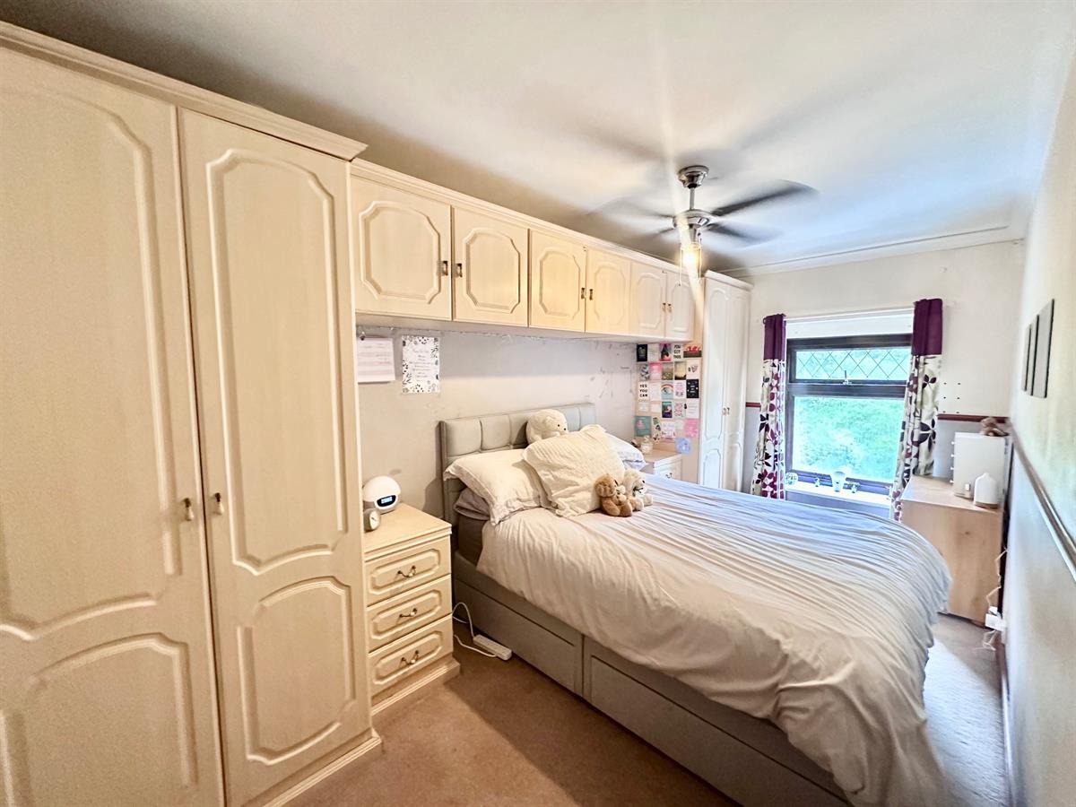 Beige carpet, lower half walls grey, upper half magnolia, white ceiling with fan light, cream over bed wardrobe unit, dark brown framed window with curtains, one white radiator, 2 double plug sockets