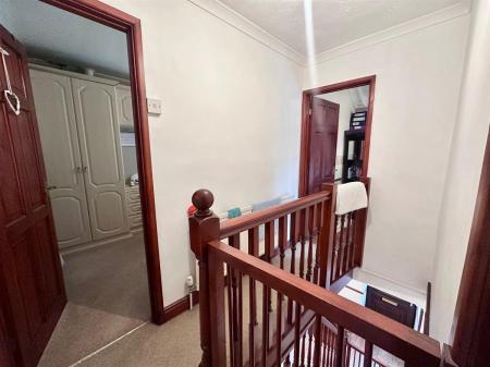 Beige carpet followed up from the stairs, red/brown wooden banister, white radiator, white walls and ceiling with light