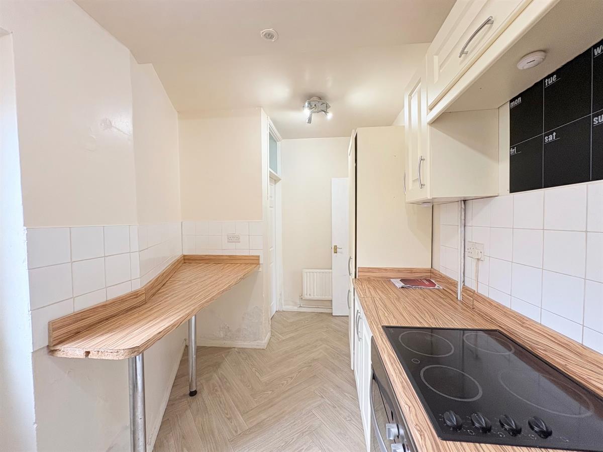 White door with gold handle upon entry, white skirting boards, cream walls, white tiling surrounding appliances, cream cupboards, wood affect worktops, three dual plug sockets, one window overlooking rear.