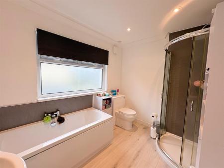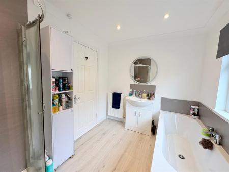 White suite comprising of w/c, quadrant shower cubicle with thermostatic mixer shower, vanity unit housing hand basin with mixer tap, double-ended bath with mixer tap, PVC panelling splashback, laminate flooring, one radiator, spotlighting, extractor fan, window to rear.