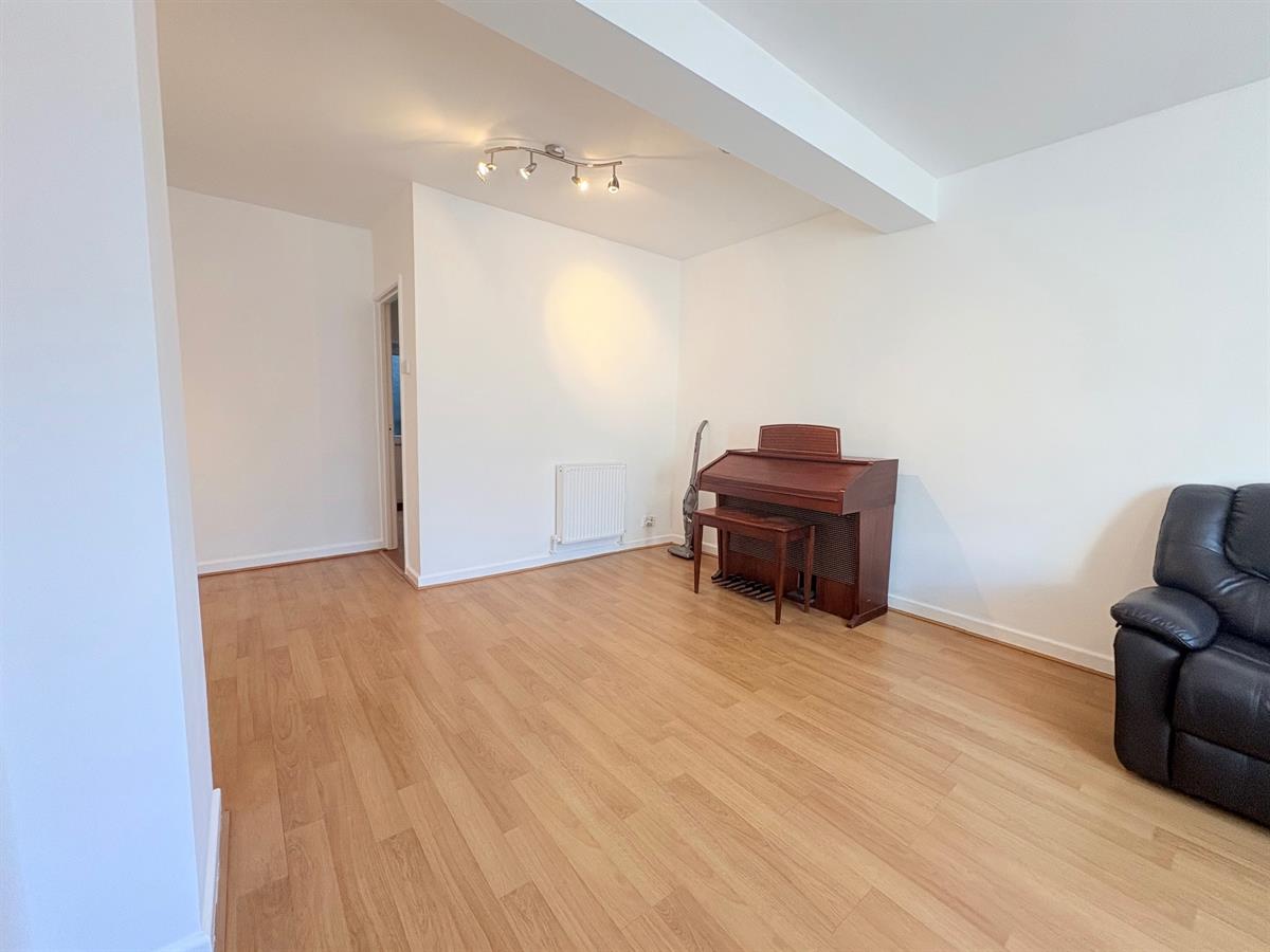 White door with gold handle upon entry, wood vinyl flooring, white skirting boards, white painted walls, two white radiators, three visible dual plug sockets, one window overlooking front, white door with gold handle leading to under stairs storage, one white door with gold handle leading to kitchen.