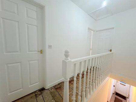 White painted bannister, white skirting boards, white painted walls, one dual plug socket, access to the loft, white doors with gold handles leading to bathroom and bedrooms.