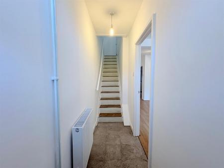 White door with gold handle upon entry, white skirting boards, white painted walls, one white radiator, white door with gold handle leading to living area, leading to staircase with white walls and a white painted bannister.