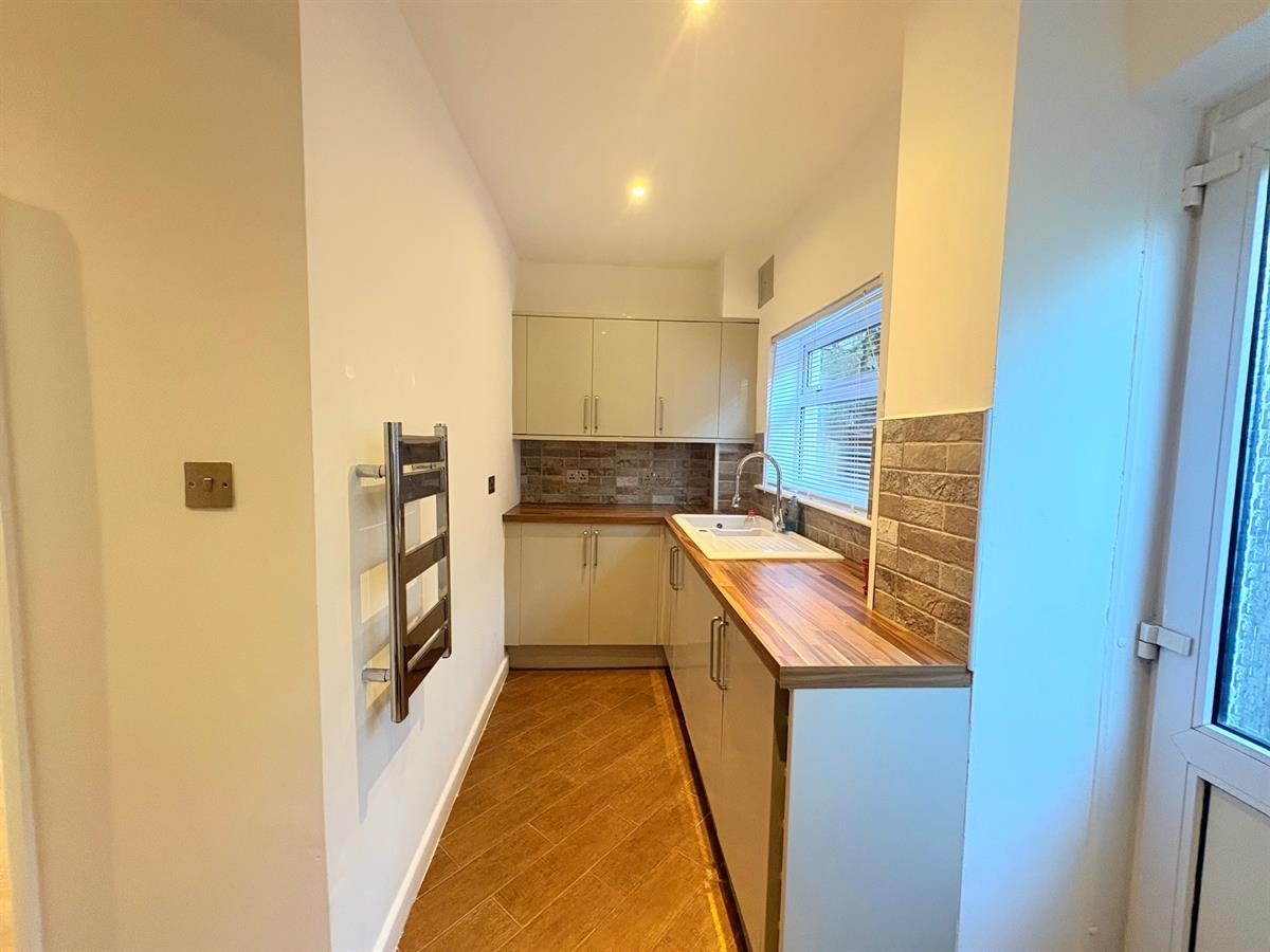 White door with gold handle upon entry, wood affect ceramic flooring, white skirting boards, white painted walls,, stone affect tiling surrounding appliances, light grey kitchen cabinets, wood affect worktops, white sink with silver tap, black electric hob, silver extraction hood, one silver radiator, four ceiling spotlights, two windows overlooking rear, one white door with gold handle leading to rear, four dual plug sockets, one white radiator.