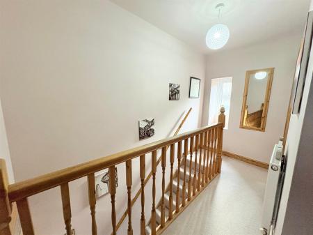 Beige carpet, light taupe wall, wooden bannister, one white radiator, one window overlooking rear, access to loft.