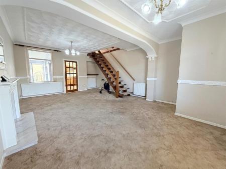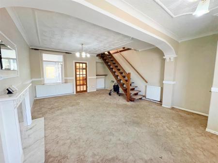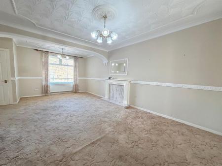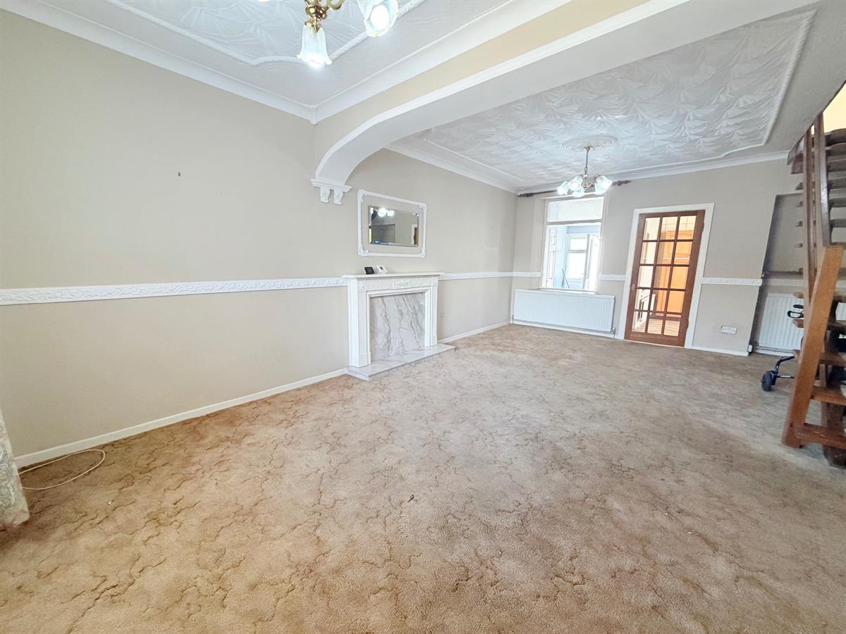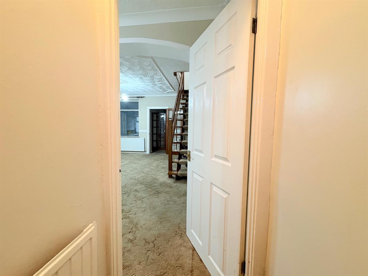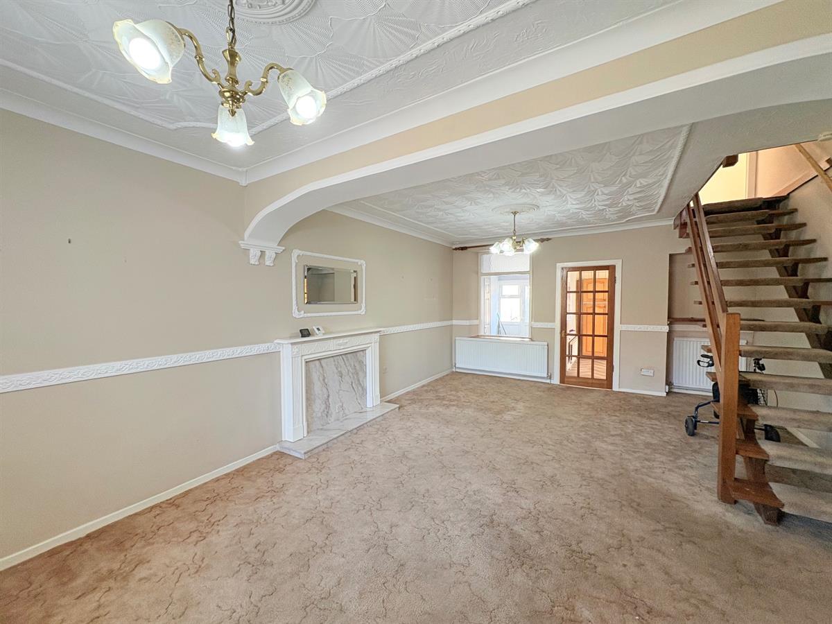 White door with gold handle upon entry, beige carpet flooring, light beige painted walls, white skirting boards, four white radiators, three dual plug sockets, three single plug sockets, blocked fireplace with beige patterned panel covering,one window overlooking utility, one brown door with gold handle upon exit to kitchen.