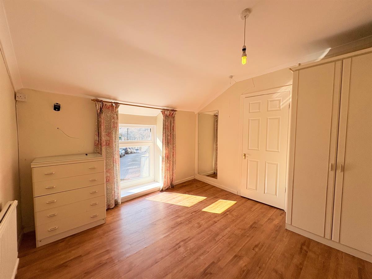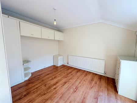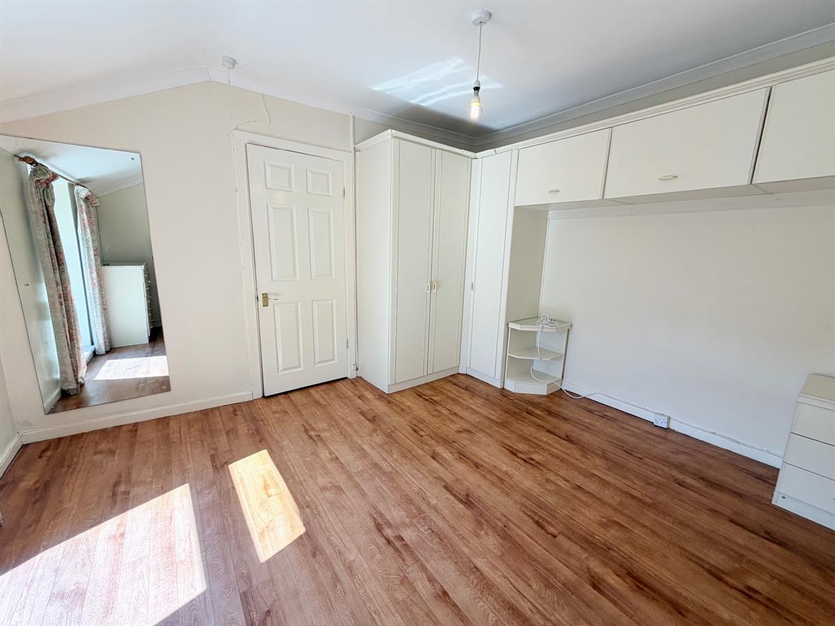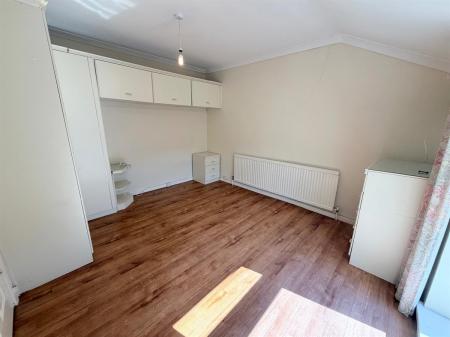 White door with gold handle upon entry, wood affect floor tiling, white skirting boards, white painted walls, two single plug sockets, one white radiator, one window overlooking side of the property, integrated white wardrobes.