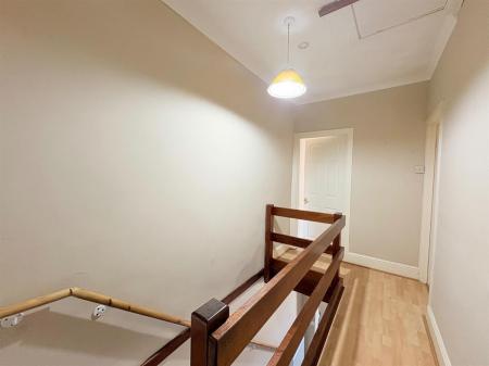 Brown stairs with beige carpet running up the centre leading to a light beige wood affect plank flooring landing, white skirting boards, white painted walls, one single plug socket, loft access.