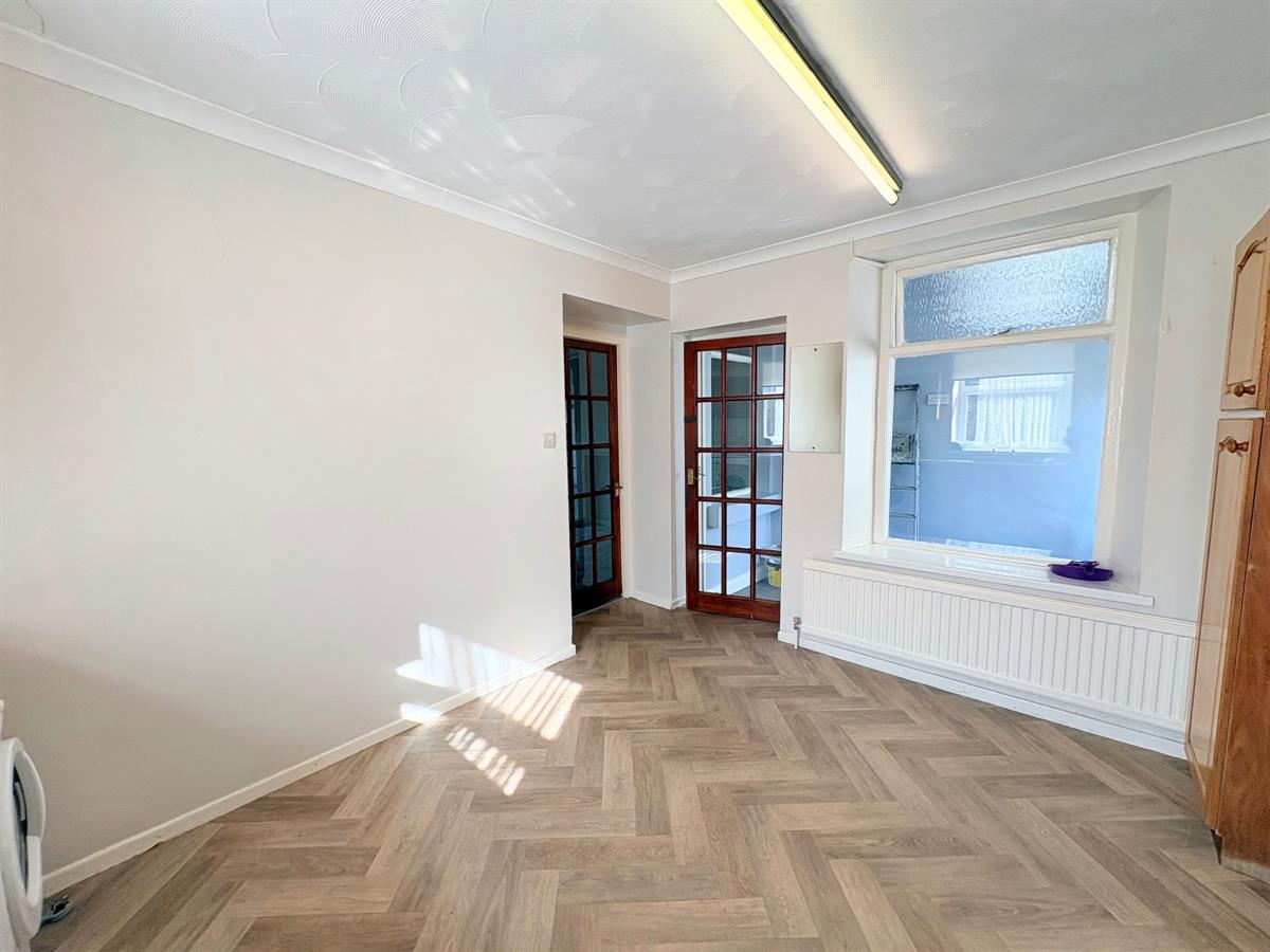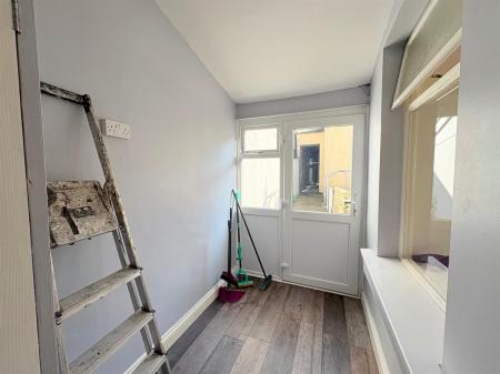 Brown door with gold handle, one step down with wood affect plank flooring, white skirting boards, light grey painted walls, white door with silver handle leading to storage cupboard, white door with silver handle leading to rear of the property, one window overlooking rear, one window overlooking kitchen, one window overlooking living area, one dual plug sockets.