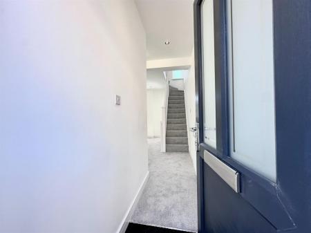 Grey front door , white from inside, silver letter box and handle, frosting down with house number on top window, one white radiator and spotlight, square black carpet as you enter, leading to grey carpet