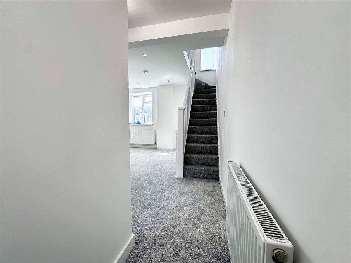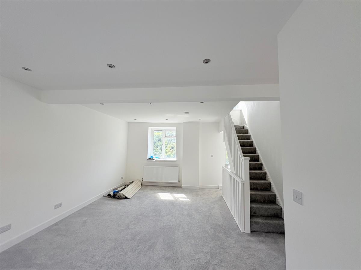 Large open plan living room, Light grey carpet, white walls and ceiling with 12 spotlights, 2 white large framed windows, 2 white radiators, 4 double plug sockets, white banister of both stairs