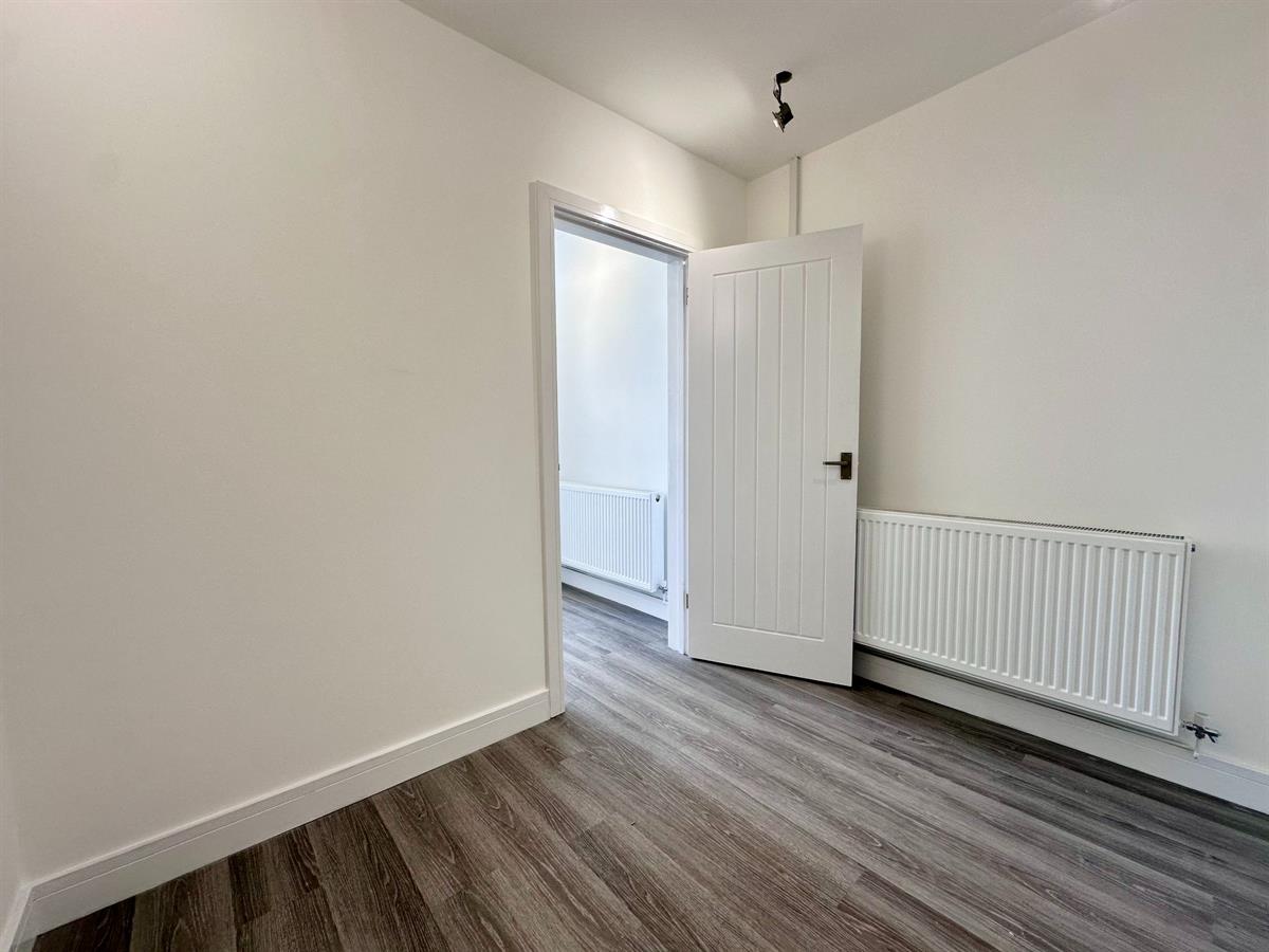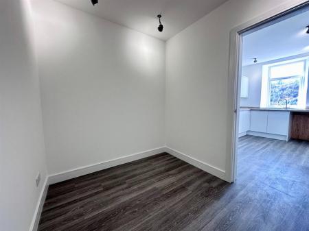 Can be used as office, living room etc. White door with grey handle from kitchen, grey lino flooring, white walls and ceiling with 4 spotlights, one white radiator, 2 double plug sockets