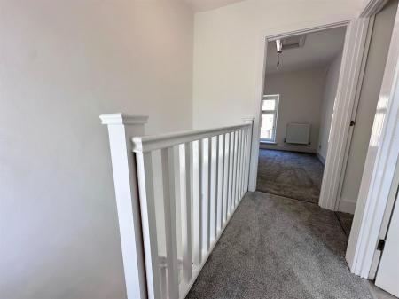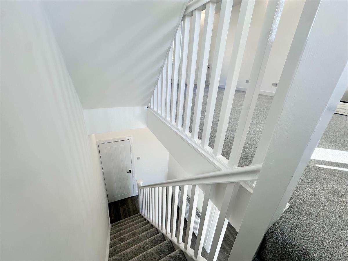 Light grey carpet, white banister, one plug socket, one ceiling light, door to bedroom 1 and 2 and bathroom