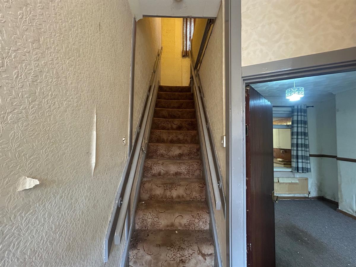 Coloured carpet, grey skirting boards, cream textured wallpaper, polystyrene tiled ceiling, fuse box boxed in wall, stairs to first floor, door to lounge