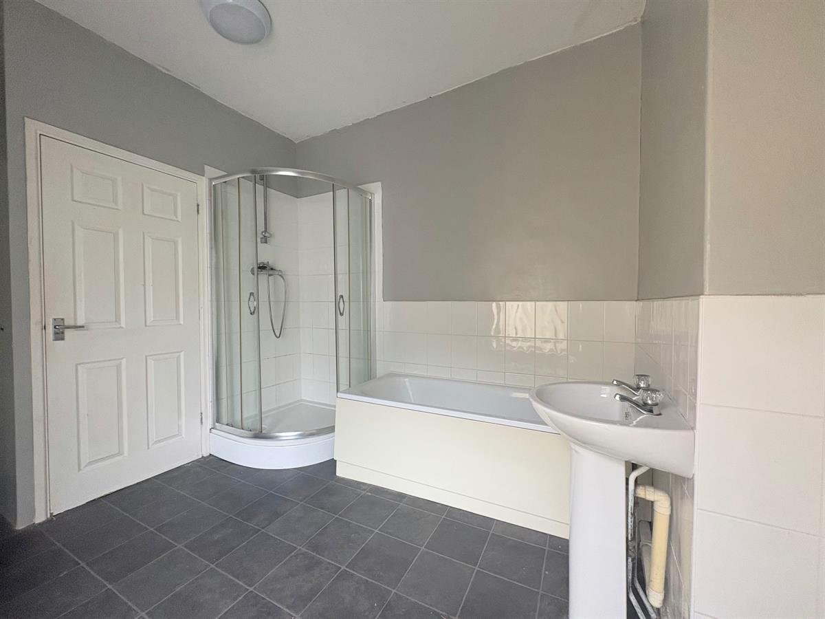 Upstairs bathroom, white door and silver handle, grey walls, white ceiling, skirting boards and radiator, grey sqaured pattern lino flooring, white sink with silver taps, white bath and toilet, shower sliding doors, white tiles, large brown framed window, grey roller blind, white door to storage and cupboard