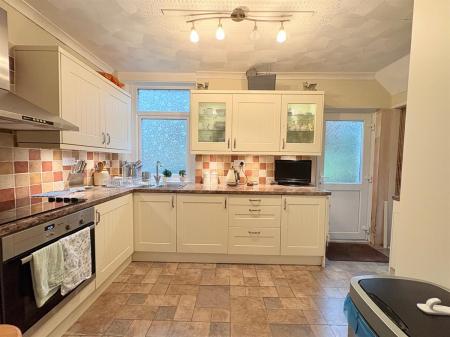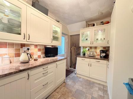 Open plan entrance from dining room, mixed stone affect beige and brown flooring, white kitchen cabinets, brown granite worktops, brown and beige mixed tiling, integrated appliances, five dual plug sockets, black electric hob, silver extraction hood, one white radiator, one window overlooking rear, one white door leading to rear, under stairs storage access.